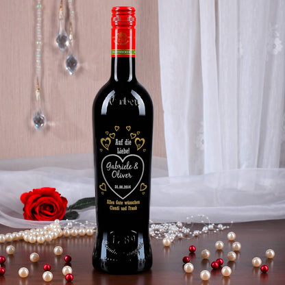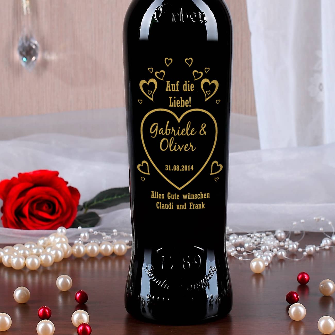 Verschenken Sie diese schöne Weinflasche zur Hochzeit mit romantischer Gravur an das frisch vermählte Hochzeitspaar! Die Weinflasche wird mit dem Schriftzug Auf die Liebe!, den Namen des Brautpaars, dem Datum der Hochzeit und einer persönlichen Widmung von Ihnen hochwertig graviert. Eine wirklich persönliche und individuelle Geschenkidee zur Hochzeit, über das sich das Paar ganz gewiss freuen wird.