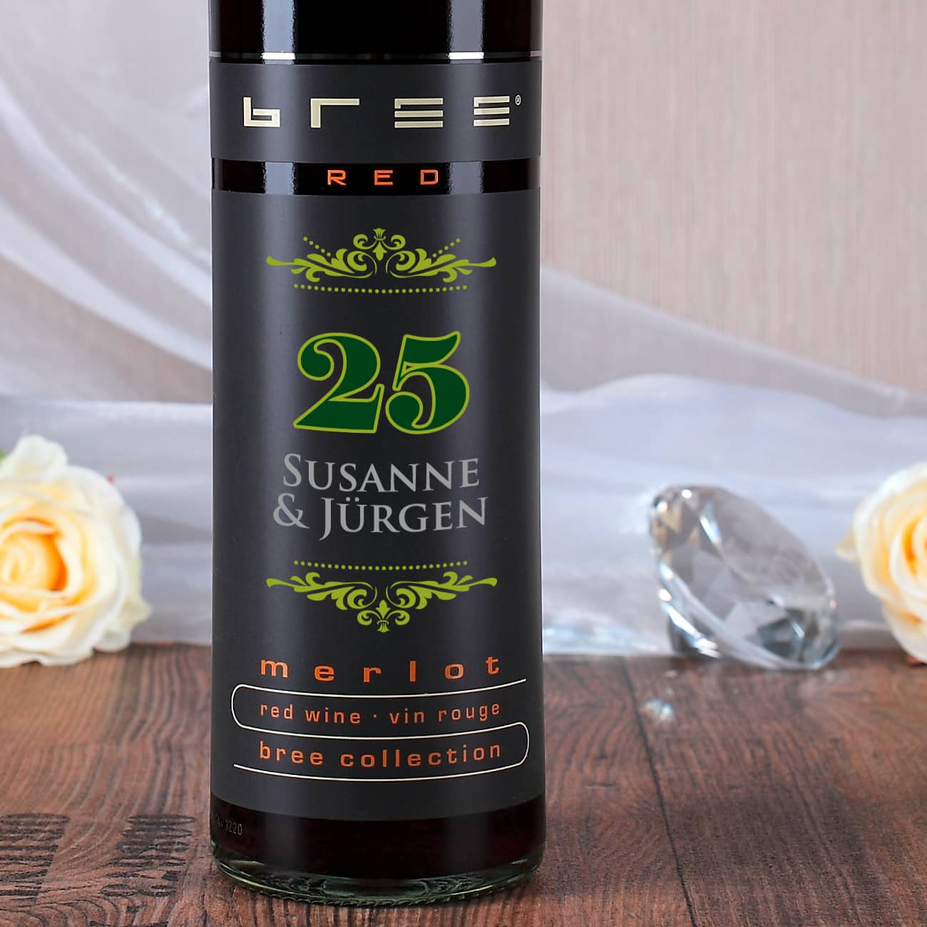 Zu einer Silbernen Hochzeit schenkt man doch etwas ganz Persönliches. Diese Weinflasche ist ein perfektes Geschenk für das Hochzeitspaar.
