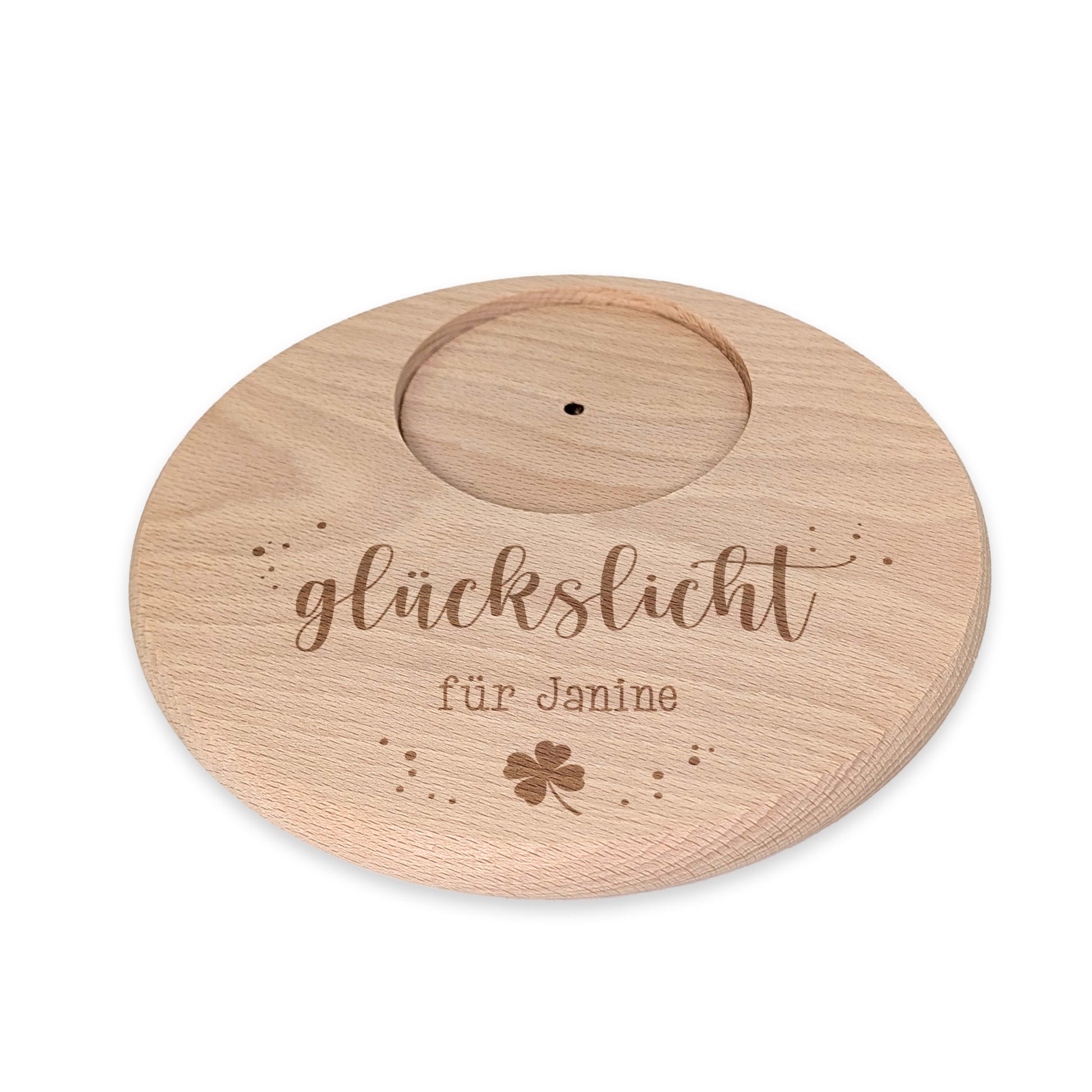 Personalisierter 'Glückslicht' Kerzenteller für geliebte Menschen mit Wunschtext aus Buchenholz