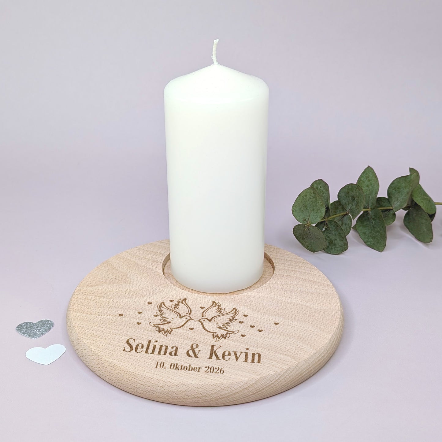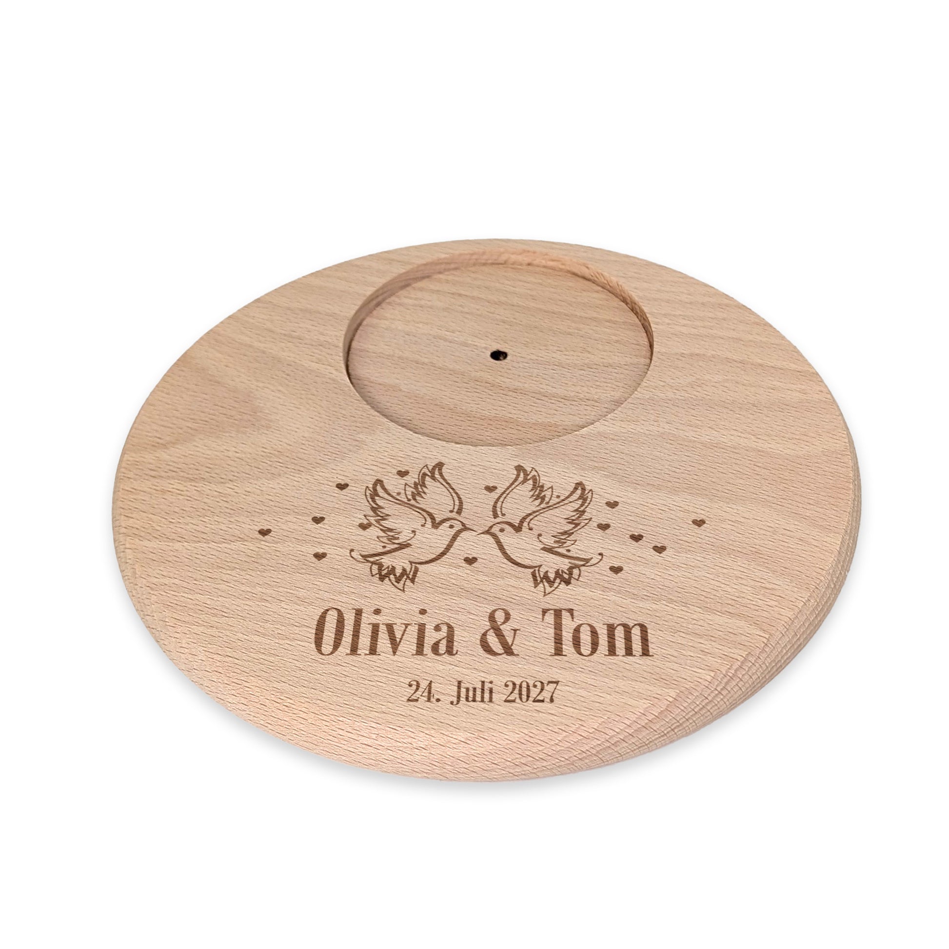 Personalisierter Kerzenteller zur Hochzeit graviert mit Namen und Datum | Buchenholz | Taubenmotiv