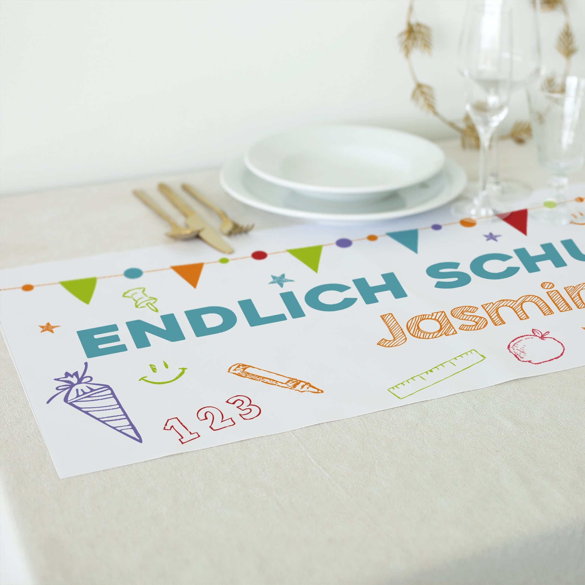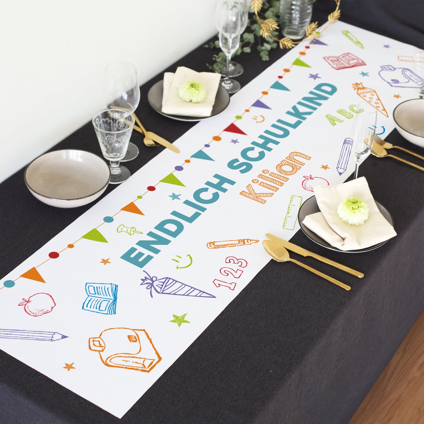 Tischläufer „Endlich Schulkind“ – Personalisierte Einschulungsdeko mit bunten Schulmotiven