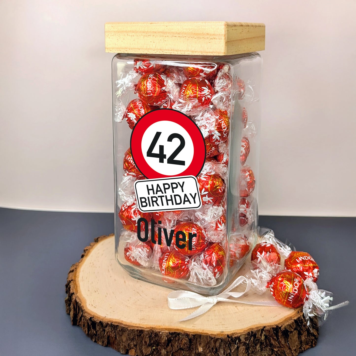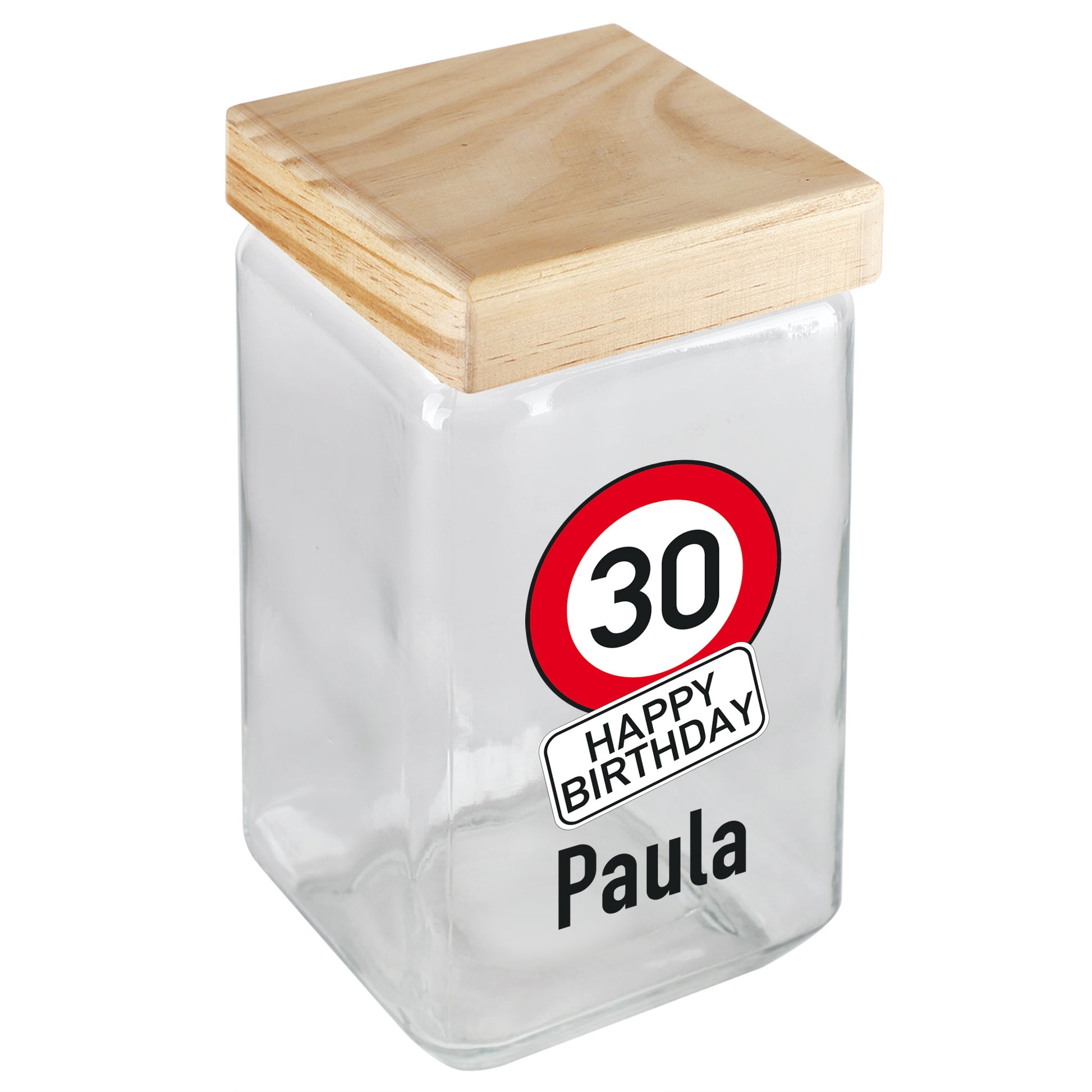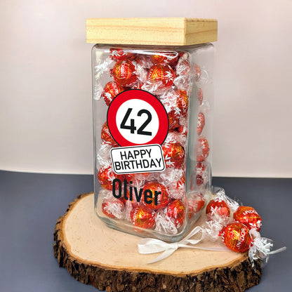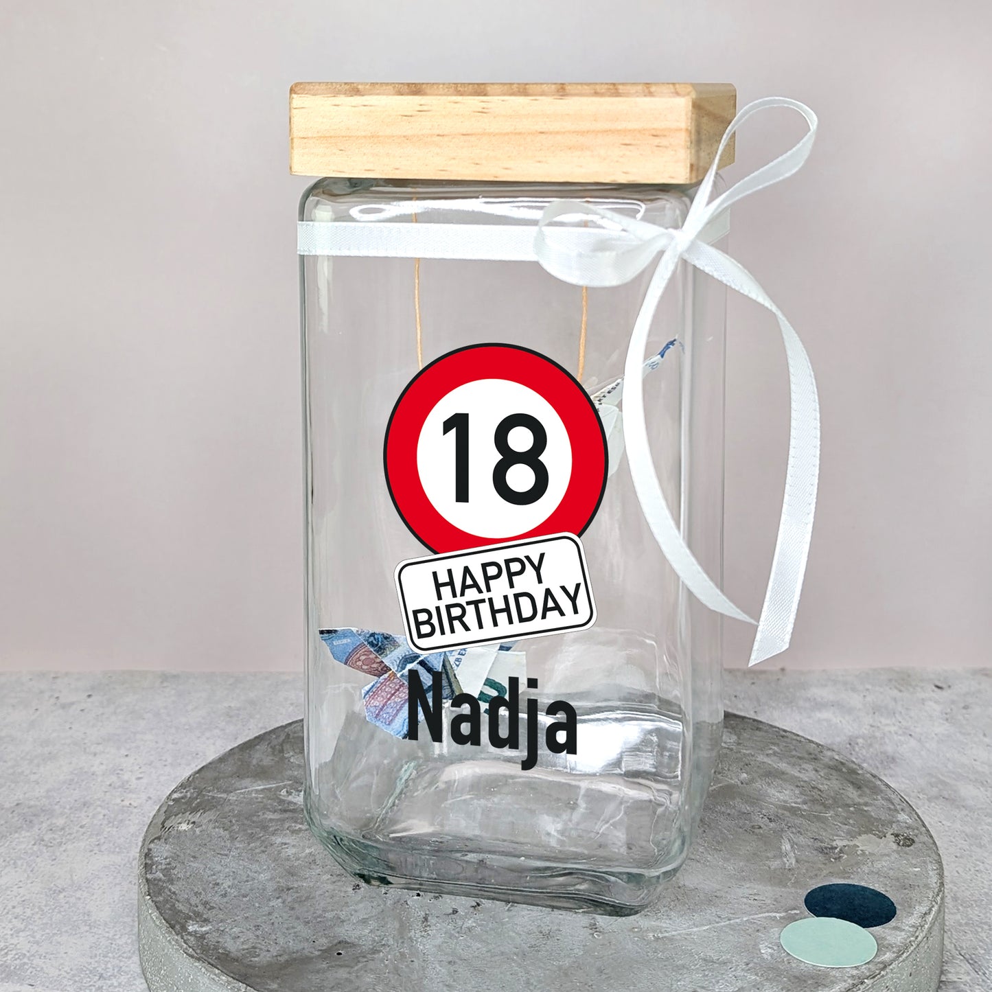 Vorratsglas zum Geburtstag mit Verkehrszeichenoptik, personalisiert mit Alter und Name