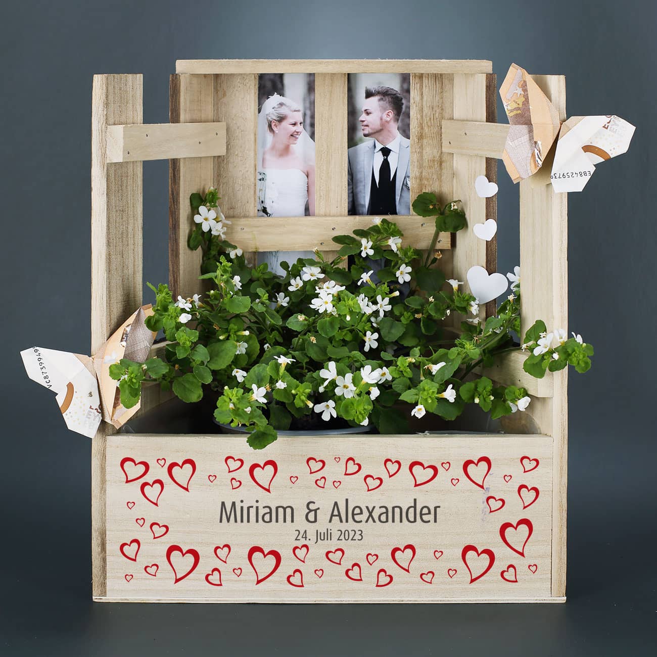Viele Ideen zur Gestaltung werden den Pflanzkorb zu einem unvergesslichen Präsent machen. So ergeben kleine Blumengestecke mit ein paar kunstvoll gefalteten Geldscheinen ein tolles Hochzeitspräsent. Geldgeschenke sind schließlich immer sehr beliebt. Ein Foto, welches von hinten durch den Fensterausschnitt des Korbes scheint, verleiht dem ganzen Ensemble das besondere Etwas. Später verleiht der Pflanzkorb jeder Wohnung und jedem Garten mit seinem individuellen Aufdruck den letzten Schliff. Werden Sie kreativ oder lassen Sie sich von uns inspirieren und verwandeln Sie den Holz-Pflanzkorb mit ein paar Handgriffen in ein einzigartiges Präsent zur Hochzeit.