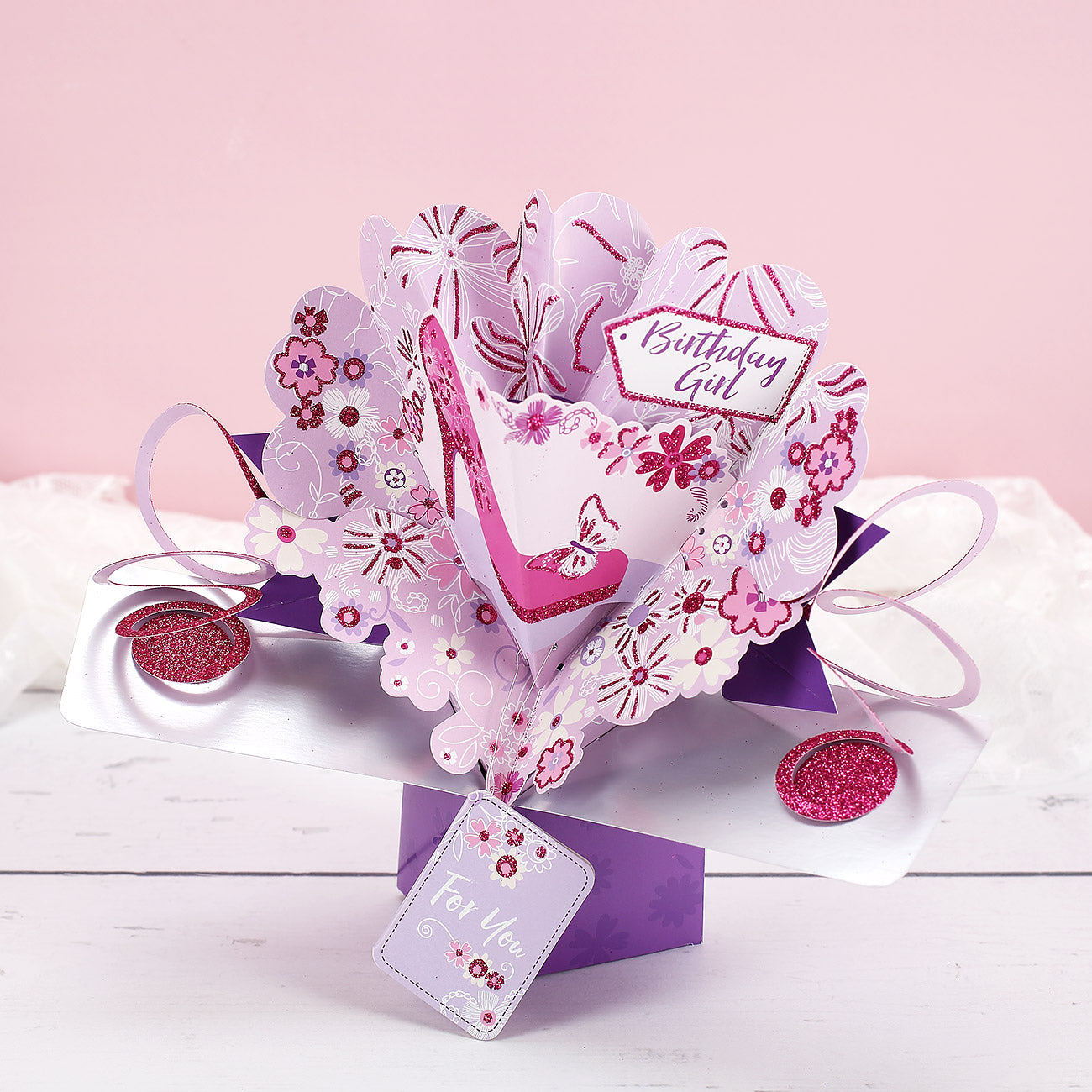 Mit dieser dreidimensionalen Geburtstagskarte lassen Sie das Mädchenherz garantiert höher schlagen. Eine Szene aus Blumen, Schmetterlingen und pinkfarbenen Glitzerschuhen entfaltet sich nach öffnen dieser Pop-Up Grußkarte.