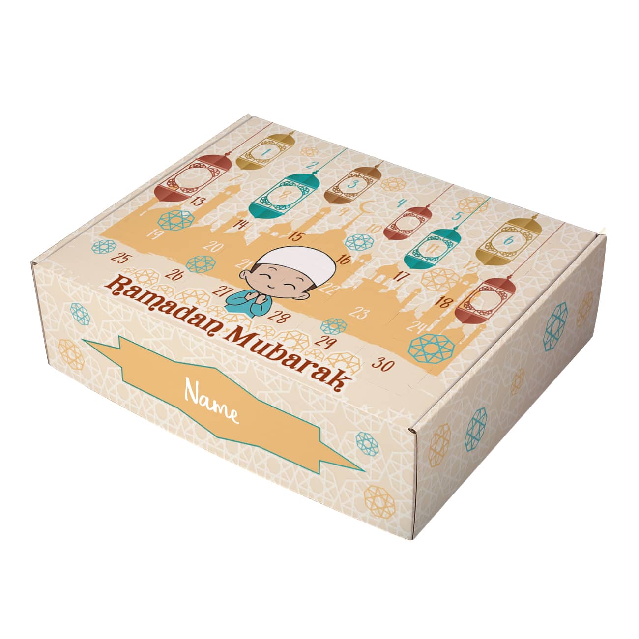 Dieser Ramadan Kalender zum selbst Befüllen erhält einen farbenfrohen Druck, der einen kleinen betenden Jungen, Laternen, Ornamente und im Hintergrund die Umrisse einer Moschee abbildet. Die Vorderseite bildet außerdem die Worte "Ramadan Mubarak" ab. So macht der Kalender zum Ramadan in jedem Kinderzimmer eine große Freude und dekoriert dieses erfolgreich passend zum Fastenmonat. Das Beste an diesem Kalender ist allerdings, dass er auch noch mit einem Namen nach Wunsch personalisiert wird. Achten Sie darauf, dass Sie den Namen korrekt eingeben, damit wir Ihnen das Geschenk mit Druck genau so herstellen und liefern können, wie Sie es auch haben möchten.
