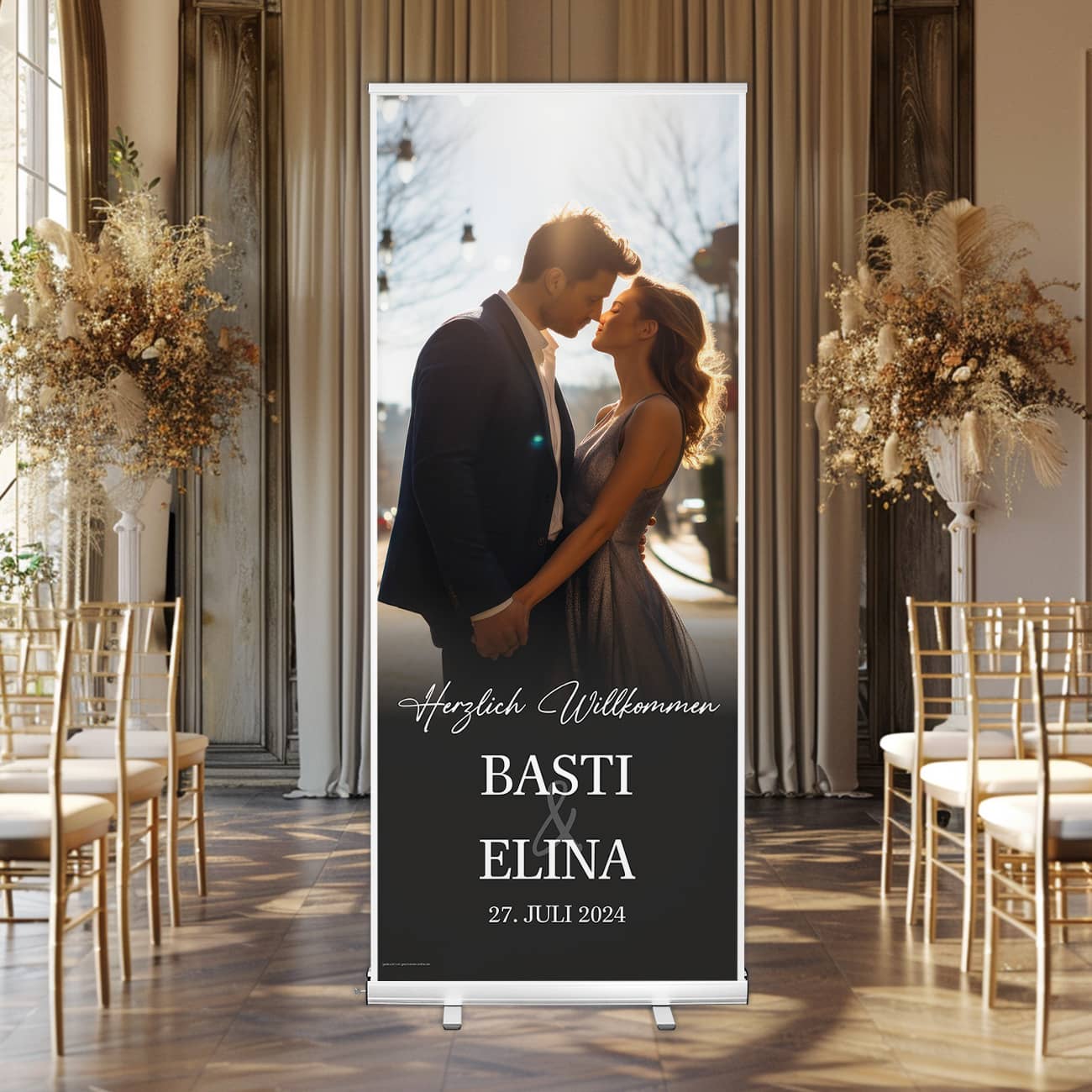 Begrüßen Sie Ihre Gäste stilvoll mit unserem hochwertigen Hochzeitsbanner als Rollup. Dieses persönliche Willkommensschild ist perfekt, um Ihre Hochzeit zu einem unvergesslichen Erlebnis zu machen. Lassen Sie uns Ihr schönstes Foto und Ihre Wunschtexte in einen eleganten Empfang verwandeln, der Ihre Gäste beeindruckt und die festliche Stimmung von Anfang an setzt.