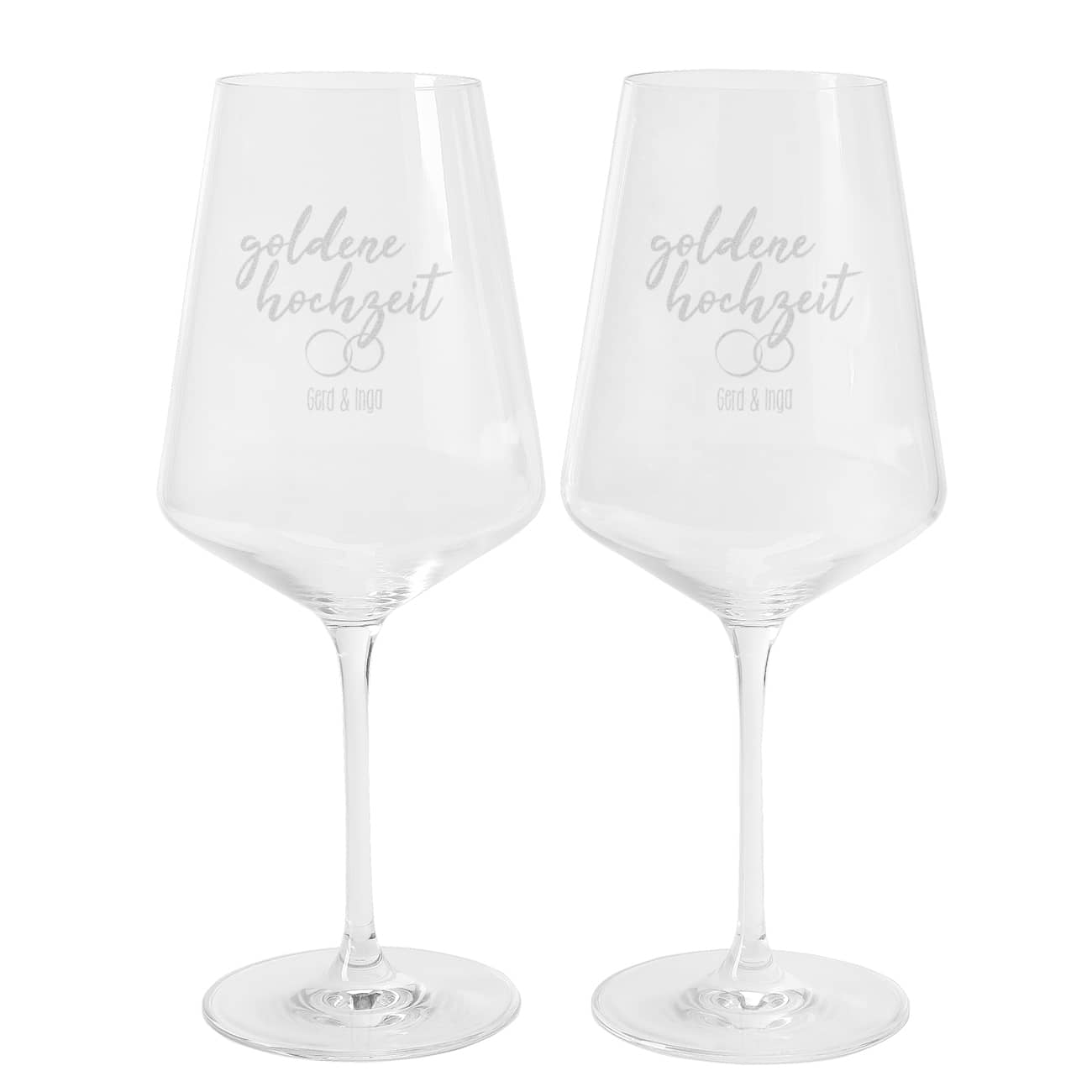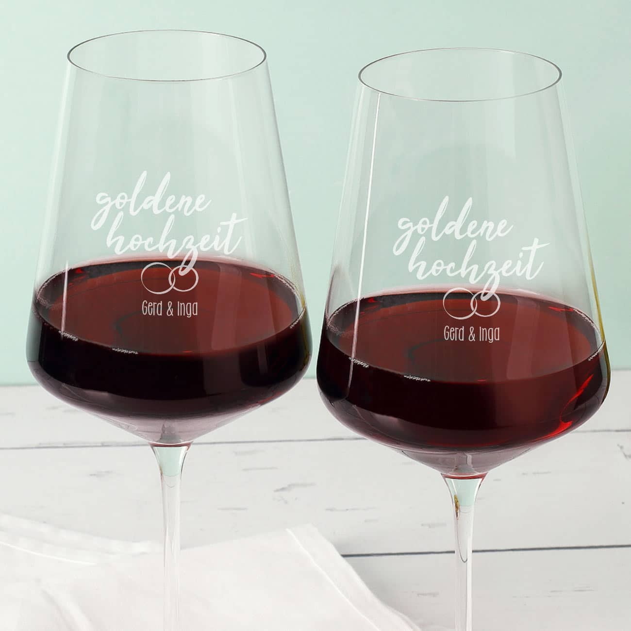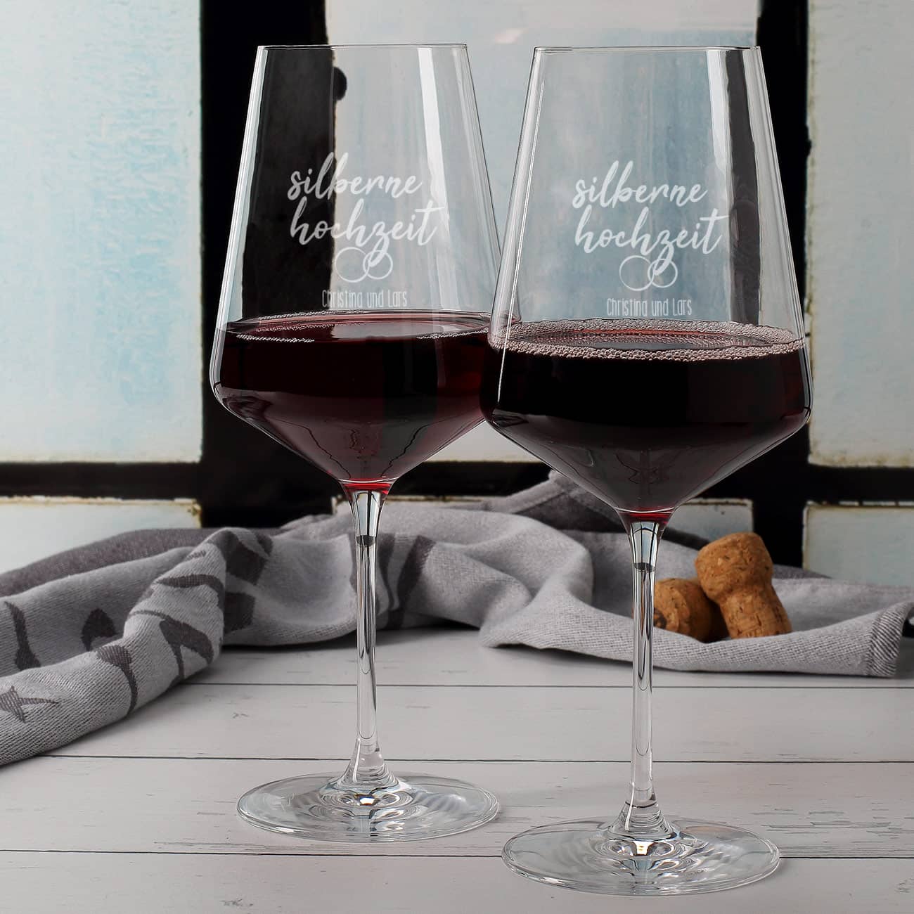 Die modernen Rotweingläser von Leonardo sind graviert mit den Worten "Silberne Hochzeit" und zwei verbundenen Eheringen, darunter findet sich Platz für die Namen des Paares.