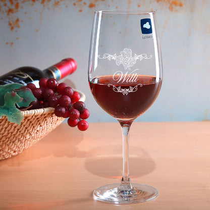Dieses formschöne Weinglas wird mit einer hochwertigen Gravur veredelt. Ob Sie es an Ihre Kollegin, einen Freund, Ihre Oma, zum Geburtstag oder zu Weihnachten verschenken, dieses Glas wird durch die Gravur zu einem ganz besonderen Geschenk. Eine Weinrebe mit Ornamenten wird auf das Glas graviert. Ihren Wunschnamen integrieren wir in das Motiv.