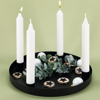 Gestalten Sie Ihre eigene einzigartige Tischdekoration mit diesem eleganten schwarzen Tablett, das mit 4 magnetischen Kerzenhaltern für Stabkerzen ausgestattet ist. Dieses Tablett bietet Ihnen die Freiheit, Ihre Kerzenhalter nach Belieben anzuordnen, um eine stilvolle und individuelle Tischdekoration zu schaffen. Wunderbar eignet sich das runde Metallbrett für einen Adventskranz, der etwas moderner und unkonventioneller sein soll. Mit Zweigen, Weihnachtskugeln und anderen Weihnachtsdekorationen lässt sich ein einmaliges Advents-Arrangement gestalten.