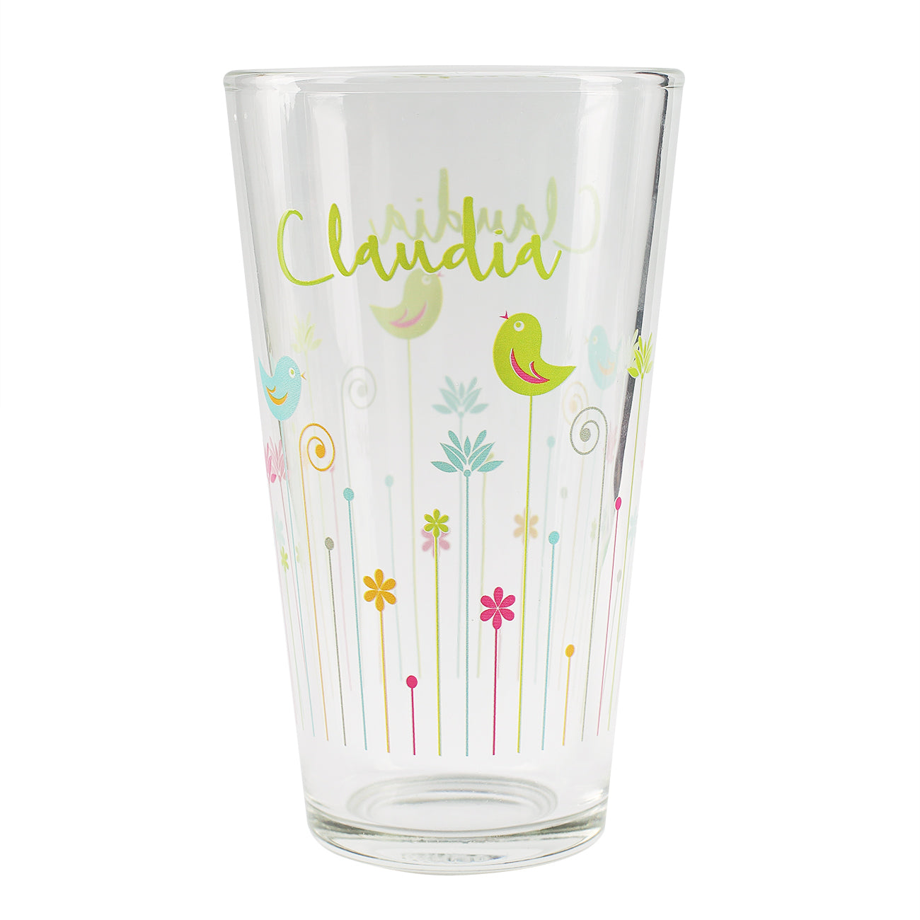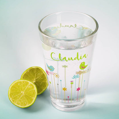 Unser bunt bedrucktes Trinkglas sorgt durch den farbenfrohen und frühlingshaften Aufdruck noch mehr für gute Laune. Das bunte Motiv aus Blumen und Vögeln wird mit Ihrem Wunschnamen vervollständigt.