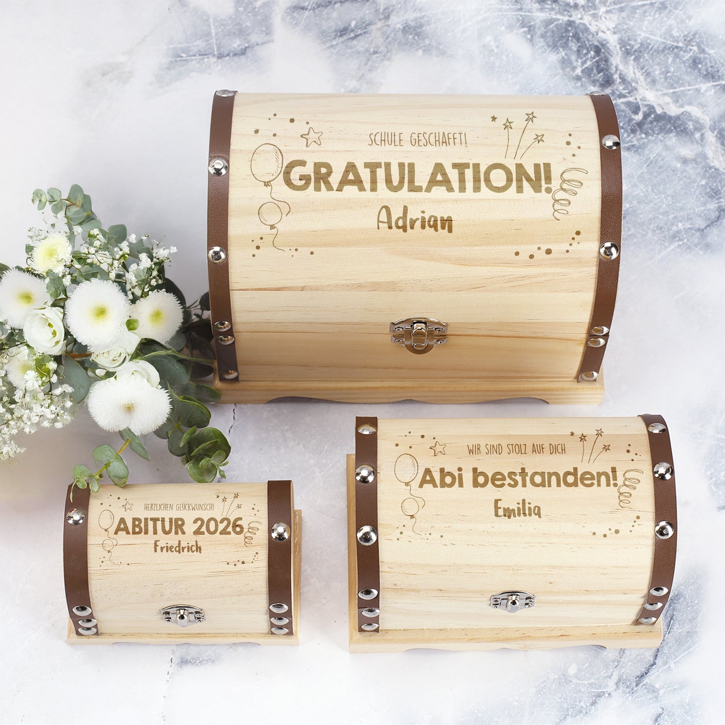 Diese stilvolle Holz-Schatztruhe ist die perfekte Geschenkidee zum bestandenen Abitur, Schulabschluss oder Geburtstag. Mit der persönlichen Gravur von Name, Jahrgang oder Glückwünschen in bis zu drei Zeilen wird die Truhe zu einem einzigartigen Erinnerungsstück.