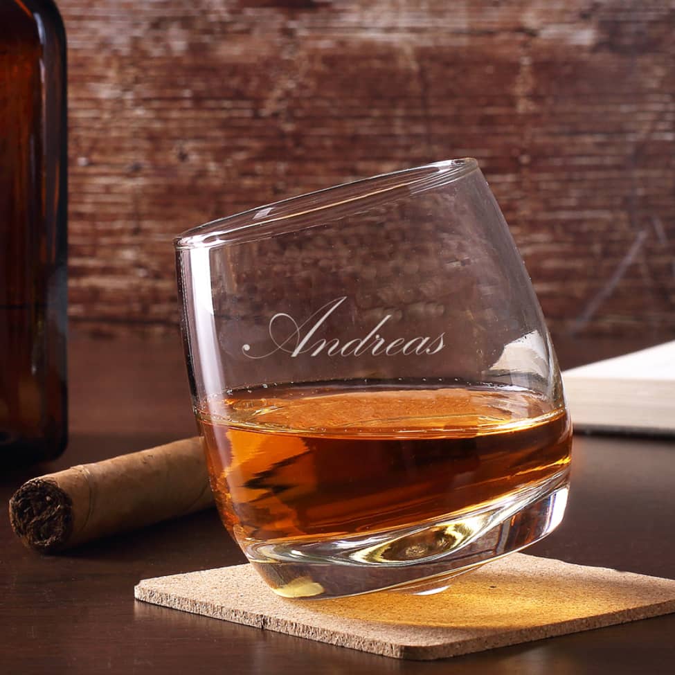 Schief stehendes Whiskyglas mit waagerechter Gravur Ihres Wunschnamens