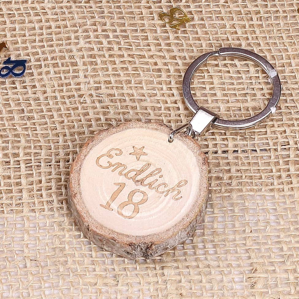 „Endlich 18“ – Zeit für Veränderungen, vielleicht das eigene Auto, der Umzug in die vier eigenen Wände oder der Beginn eines neuen Abenteuers. Dieser Schlüsselanhänger in Form einer kleinen Holzscheibe und der Gravur „Endlich 18“, die mit einem kleinen Sternchen vollendet wird, macht sich hervorragend an den eigenen Schlüsseln und der neu erworbenen Freiheit.