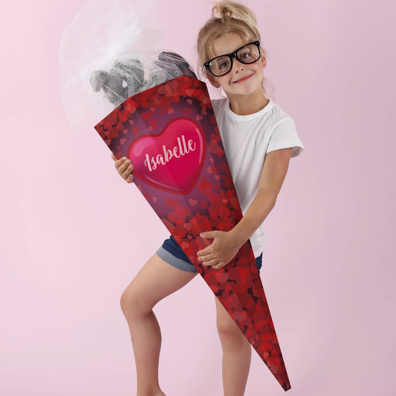 Die Schultüte mit vielen Herzen wird Ihre Tochter nicht nur mit einem spannenden Inhalt begeistern, sondern auch mit ihrer auffallenden Optik. Der persönliche Namensaufdruck im großen Herz hilft beim Zuordnen am Tag der Einschulung und macht die Zuckertüte zu einem Unikat.
