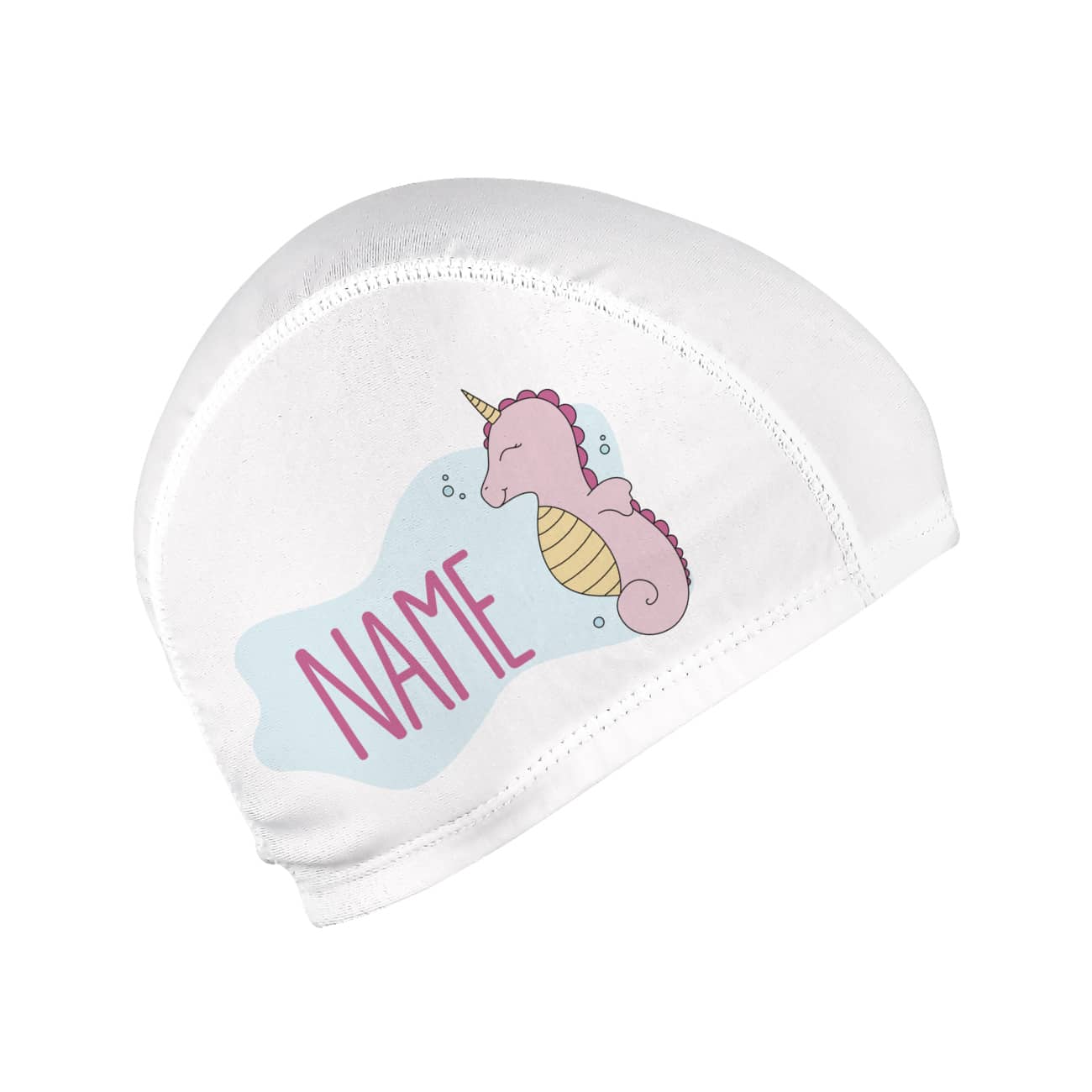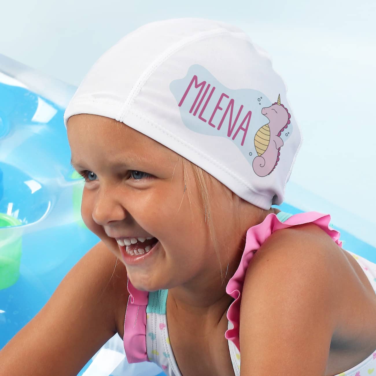 Die Badekappe wird an einer Seite mit dem niedlichen Seepferdchen bedruckt. Die leuchtenden rosanen Farbtöne lassen das Mädchenherz höher schlagen. Neben dem Seepferdchen platzieren wir groß den Namen der Empfängerin. Mit unserer Produktvorschau können Sie sich eine etwaige Ansicht Ihrer fertigen Badekappe machen.