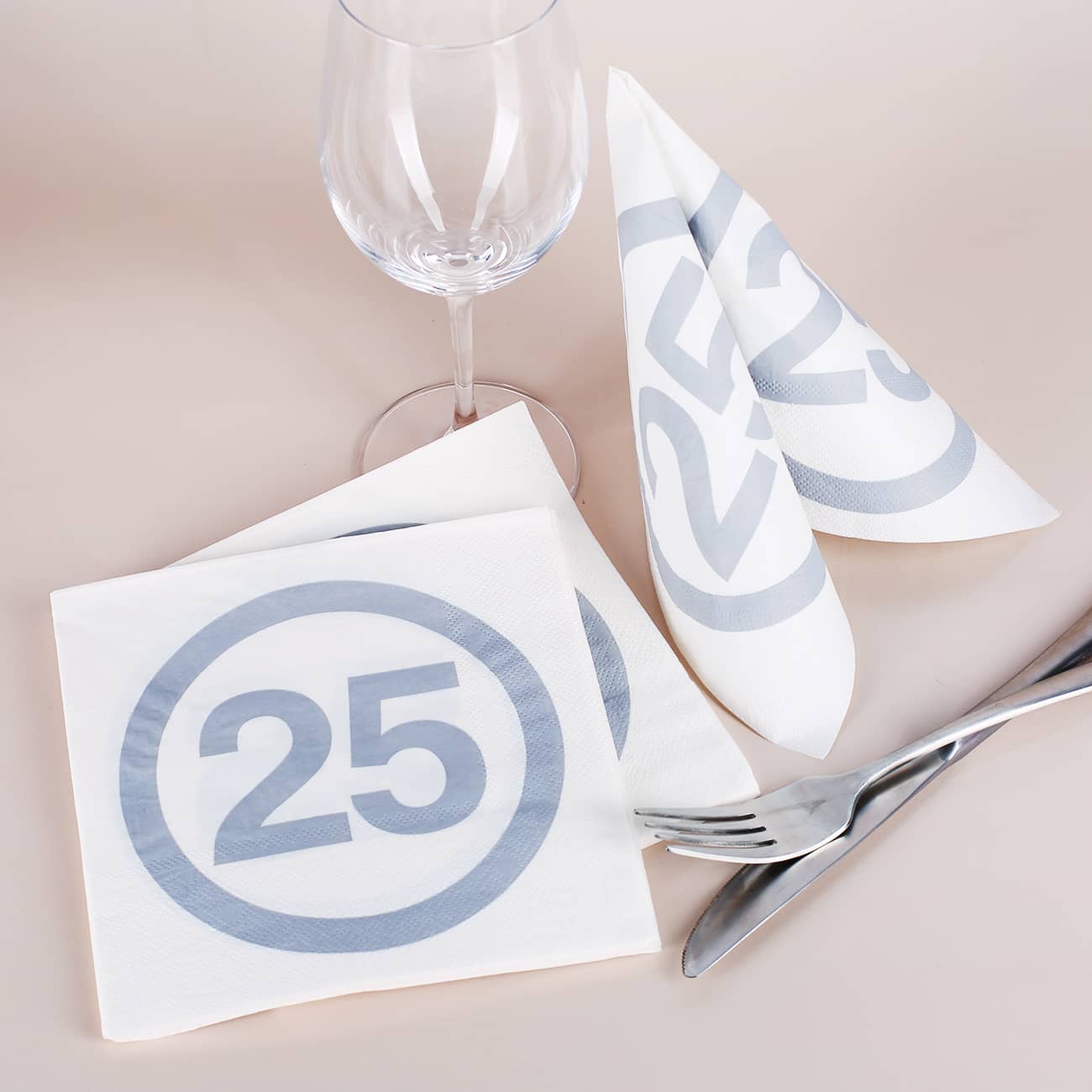 Diese zeitlosen Papierservietten sind die ideale Tischdekoration für Ihre Feier zur silbernen Hochzeit. Schmücken Sie die Festtafel, das Buffet oder setzten Sie Akzente mit diesen Servietten. 25 Jahre Ehe müssen gefeiert werden und passend dazu bieten wir diese Motivservietten mit der silberfarbenen eingekreisten 25 an. 20 Stück sind in einer Packung enthalten und haben gefaltet eine Maße von 16,5 x 16,5 cm.