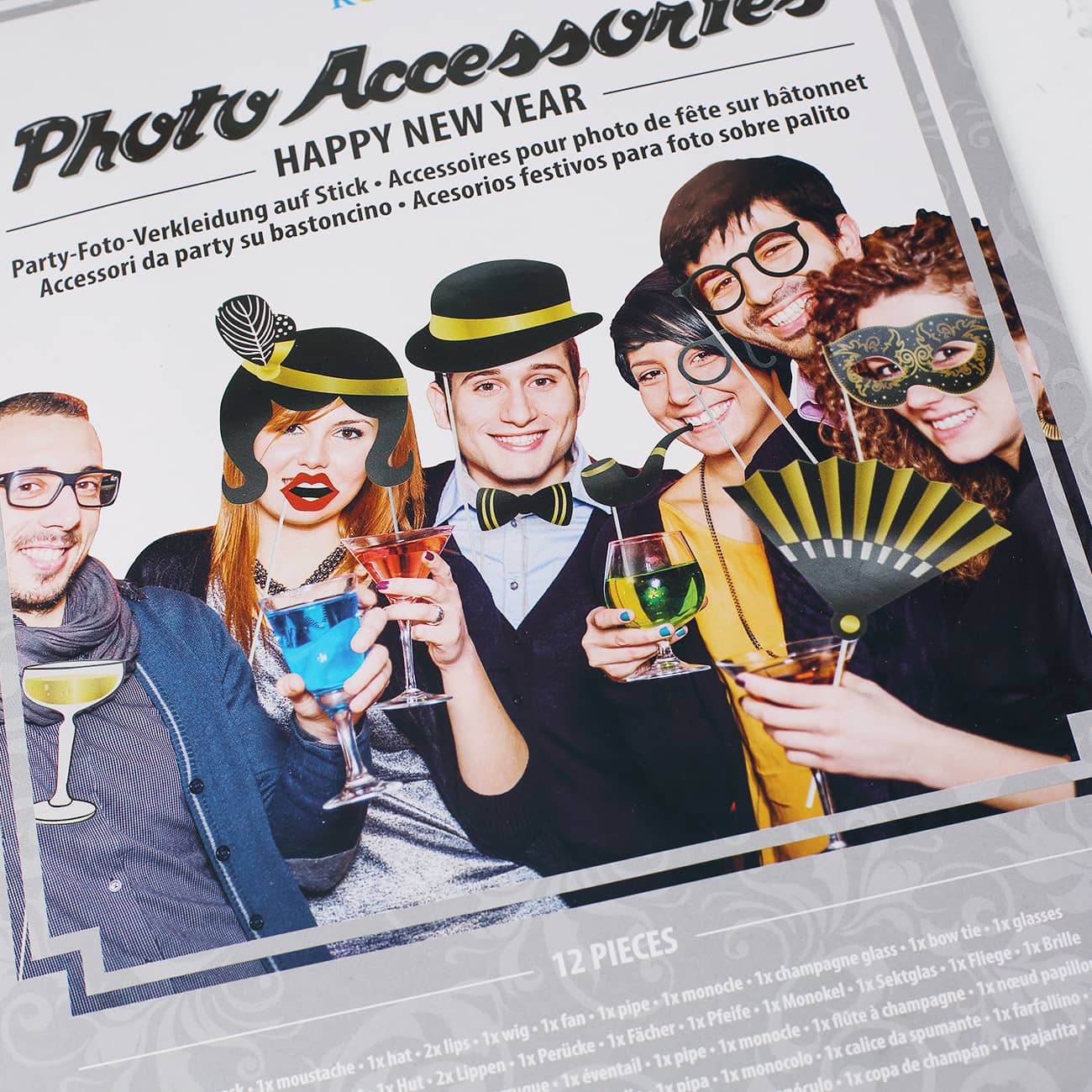 Sorgt für ausreichend (Verkleidungs-)spaß an Silvester: damit Ihre Feier in das neue Jahr nicht wie jede wird, sorgen die Foto-Accessoires für etwas Abwechslung. Zusammen mit Freunden können sich Brille, Schnurrbart, 20er-Jahre-Perücke, Fächer oder Sektglas aus Pappe geschnappt werden – in dem 12-teiligen Set ist für jeden etwas dabei! Ab damit aufs Foto und die Silvester-Erinnerung für das Jahr steht!