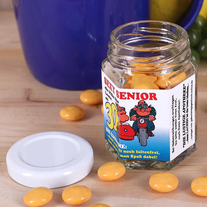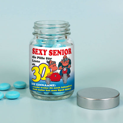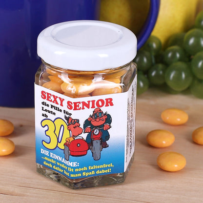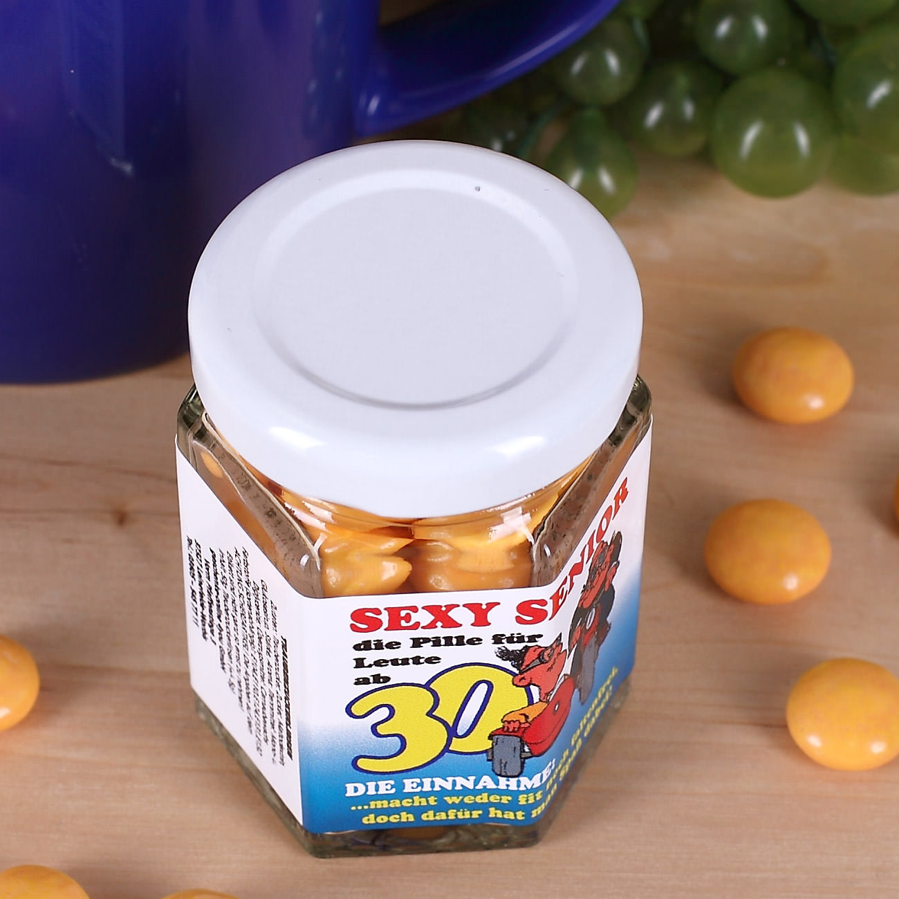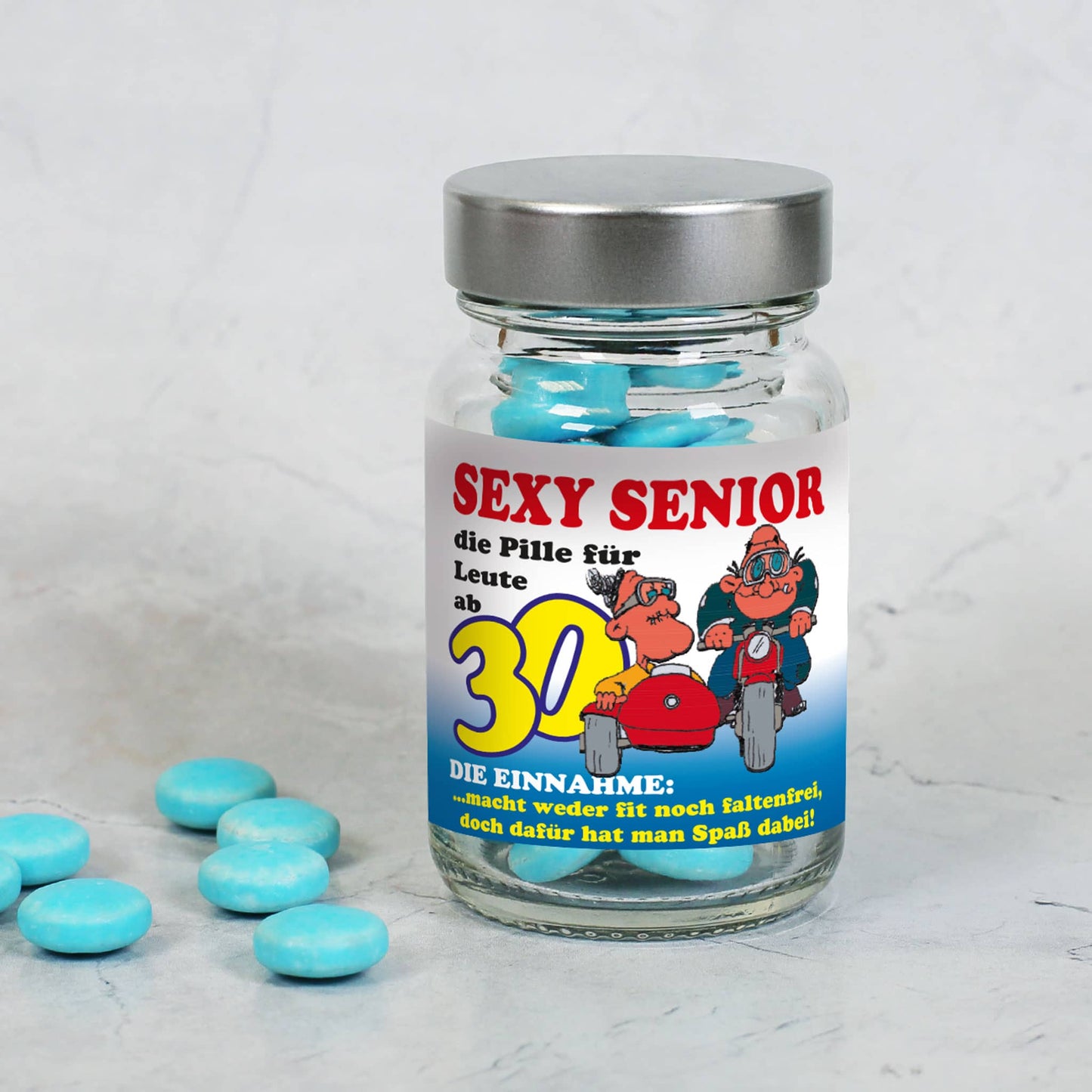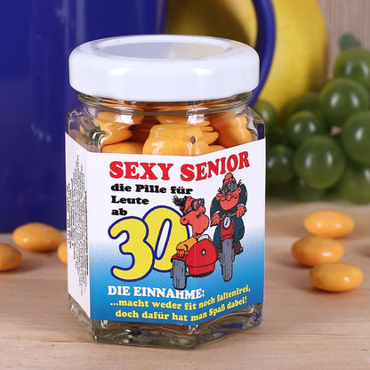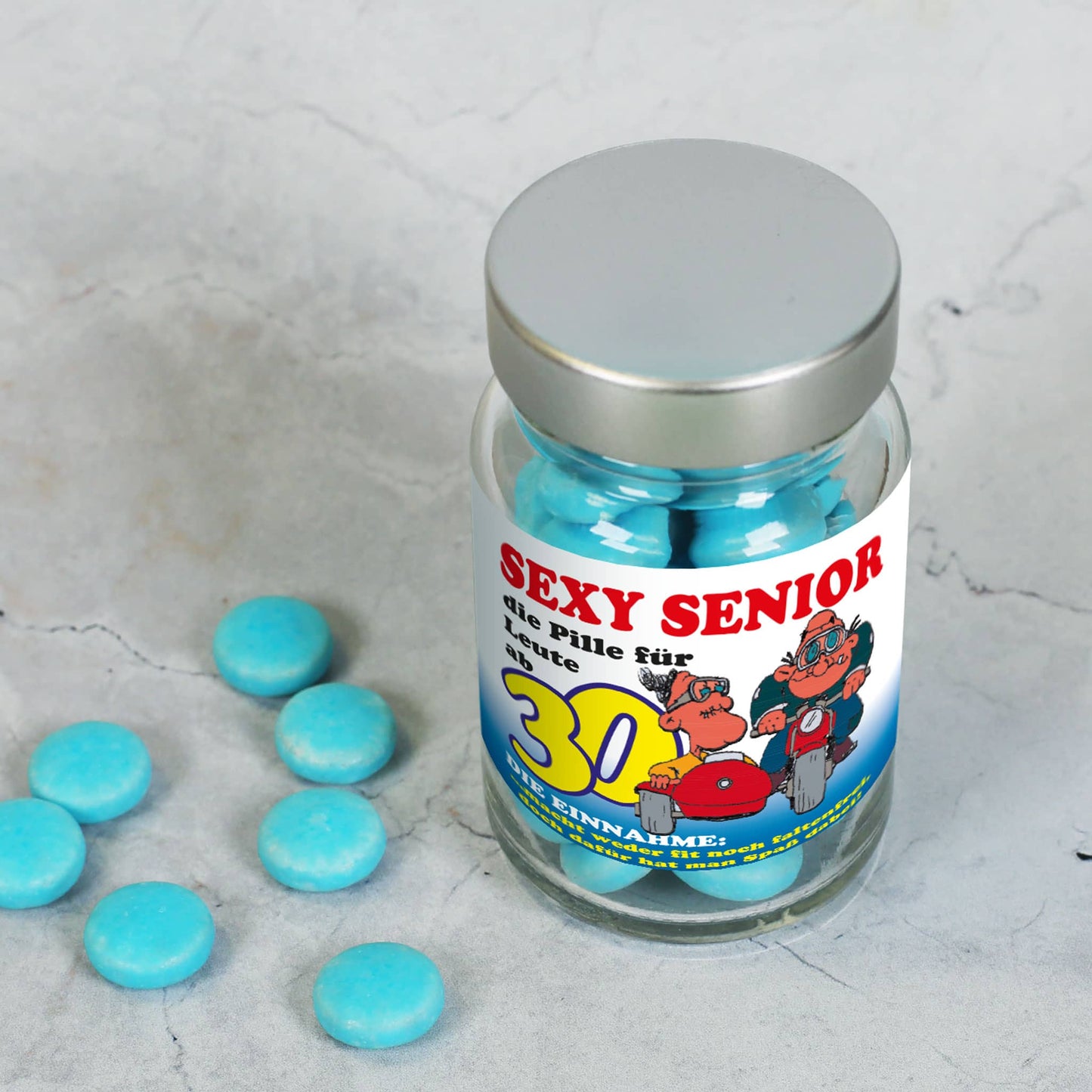 Dieses Geschenk ist für alle die mit 30 schon nachhelfen müssen. Die SEXY SENIOR PILLEN ist heiß begehrt und ein riesen Brüller auf jedem 30. Geburstag. Doch Vorsicht! Die Einnahme macht weder fit noch faltenfrei, doch dafür hat man Spaß dabei!