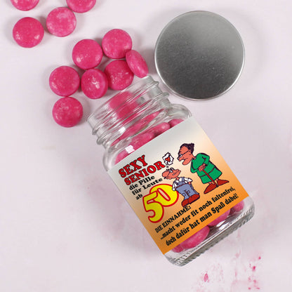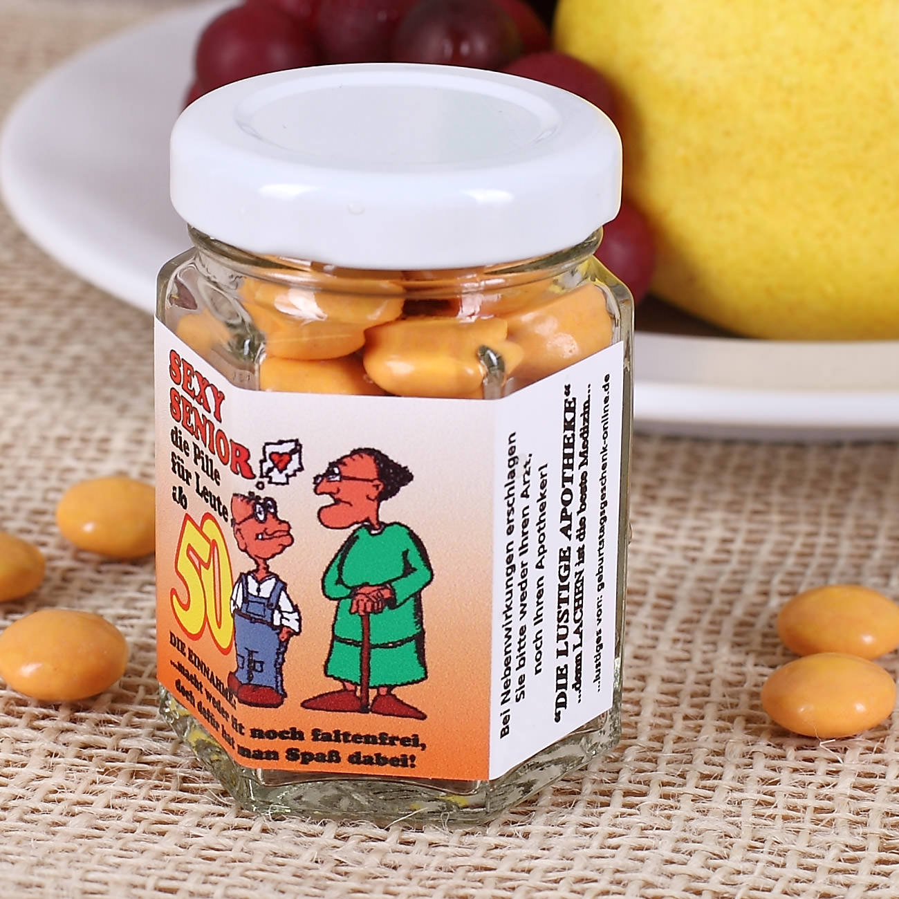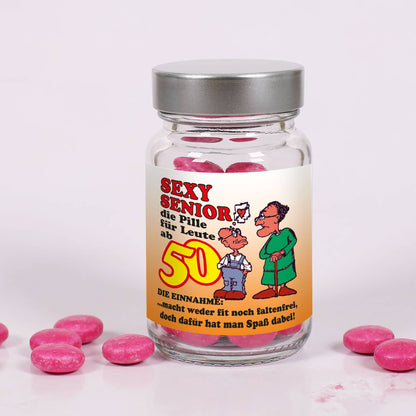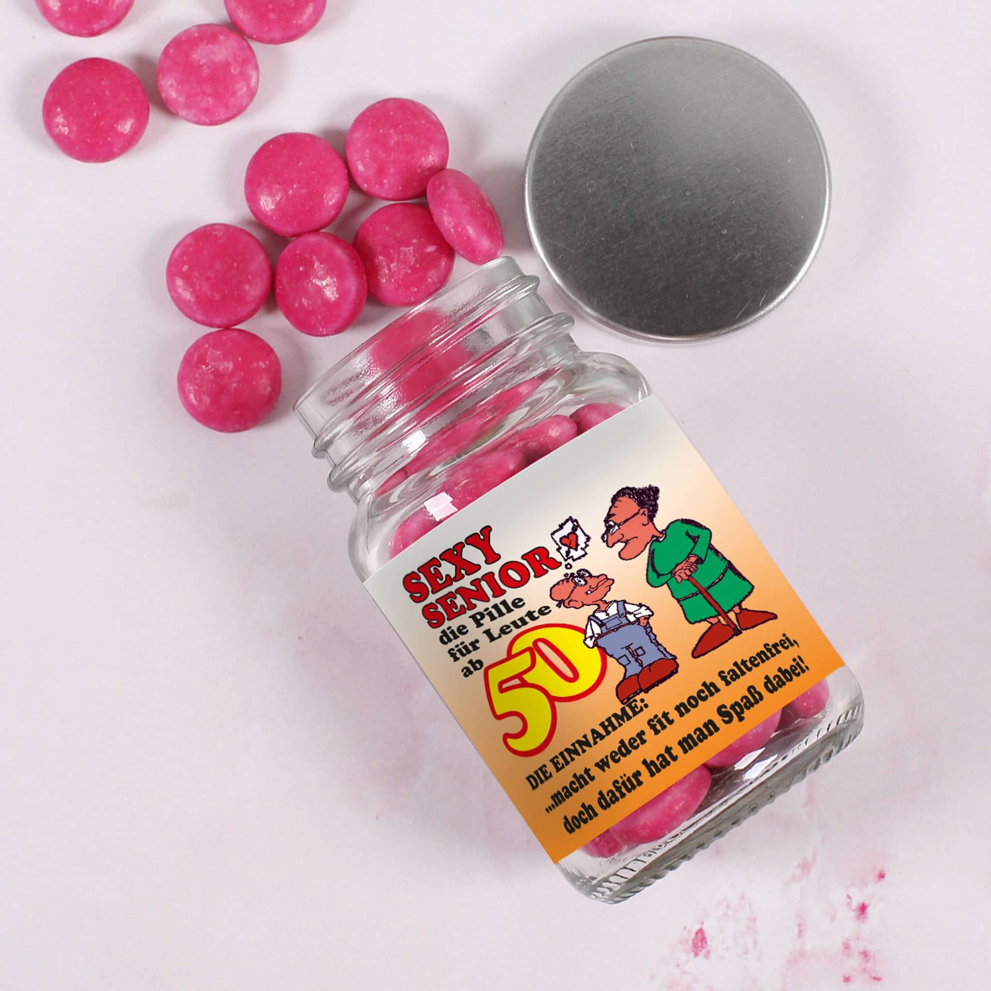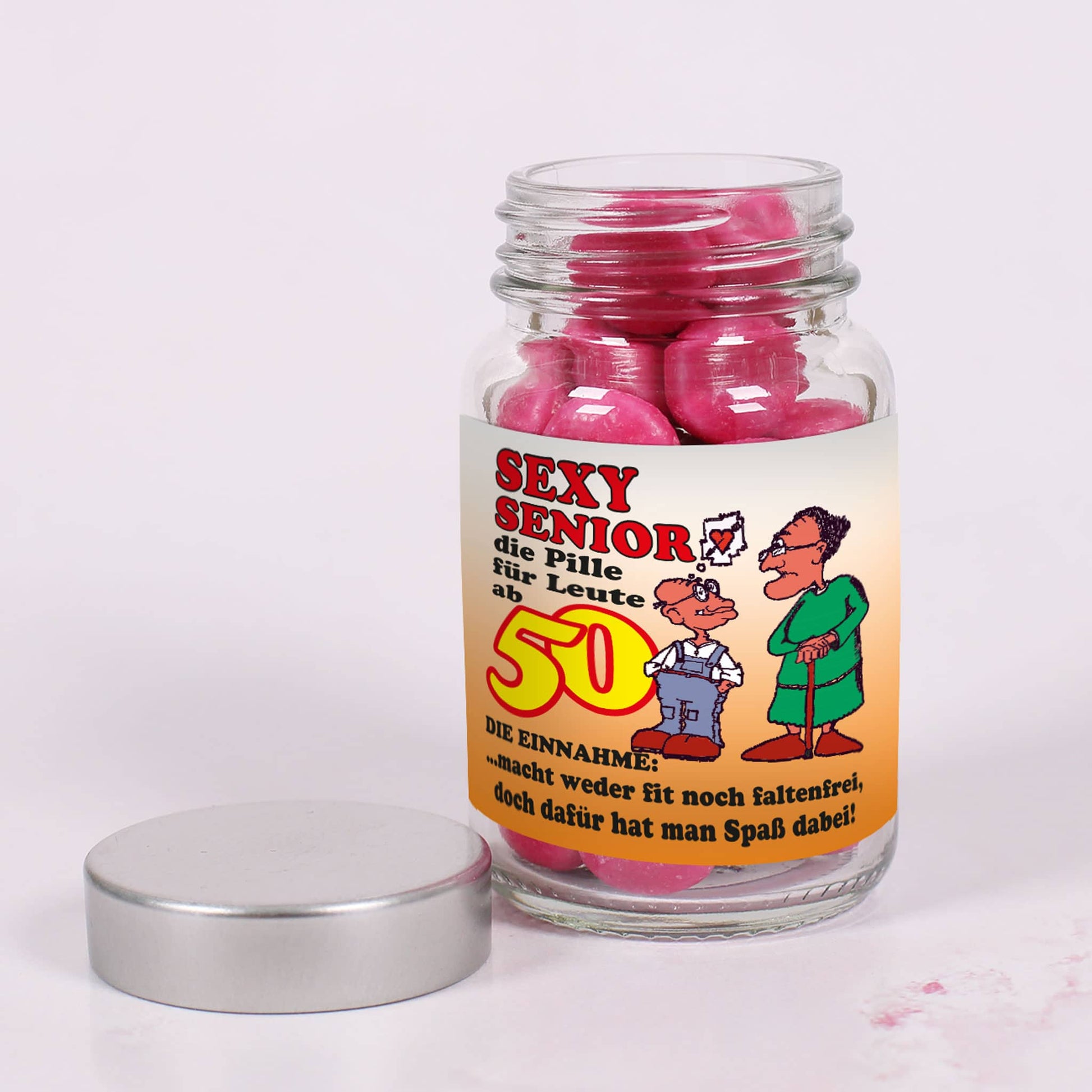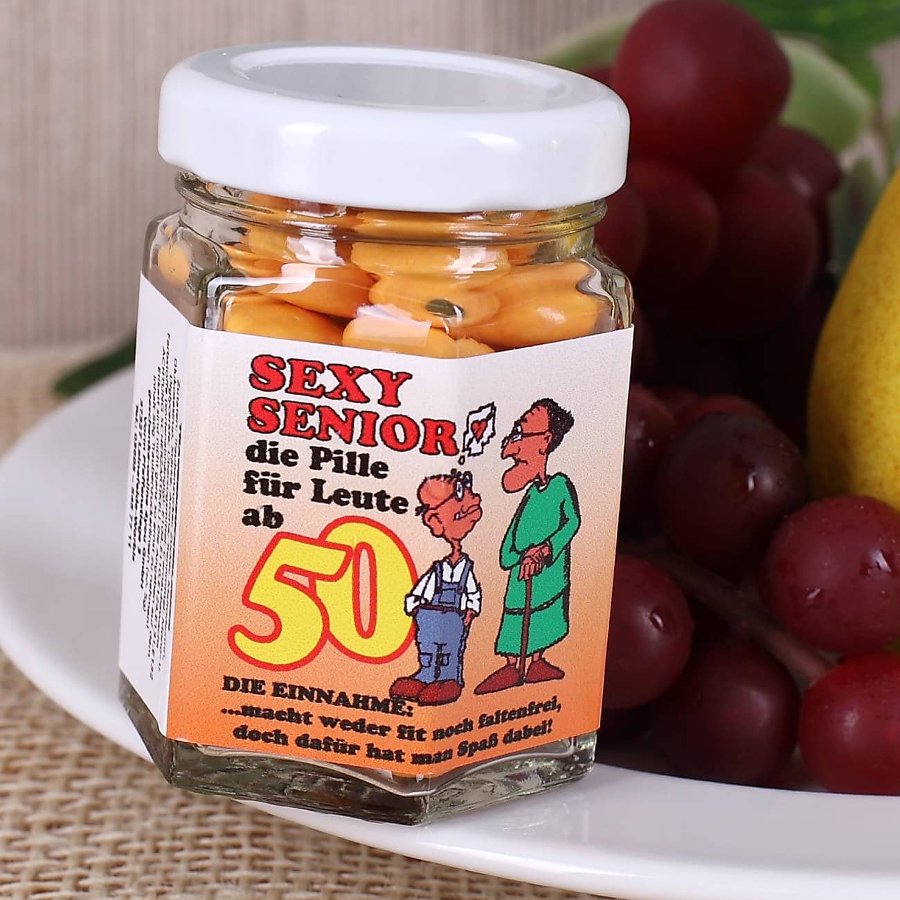 Das Spaßgeschenk SEXY SENIOR PILLEN ist heiß begehrt und garantiert immer wieder einen Lacher zum 50. Geburtstag. Doch Vorsicht! Die Einnahme macht weder fit noch faltenfrei, doch dafür hat man Spaß dabei!
