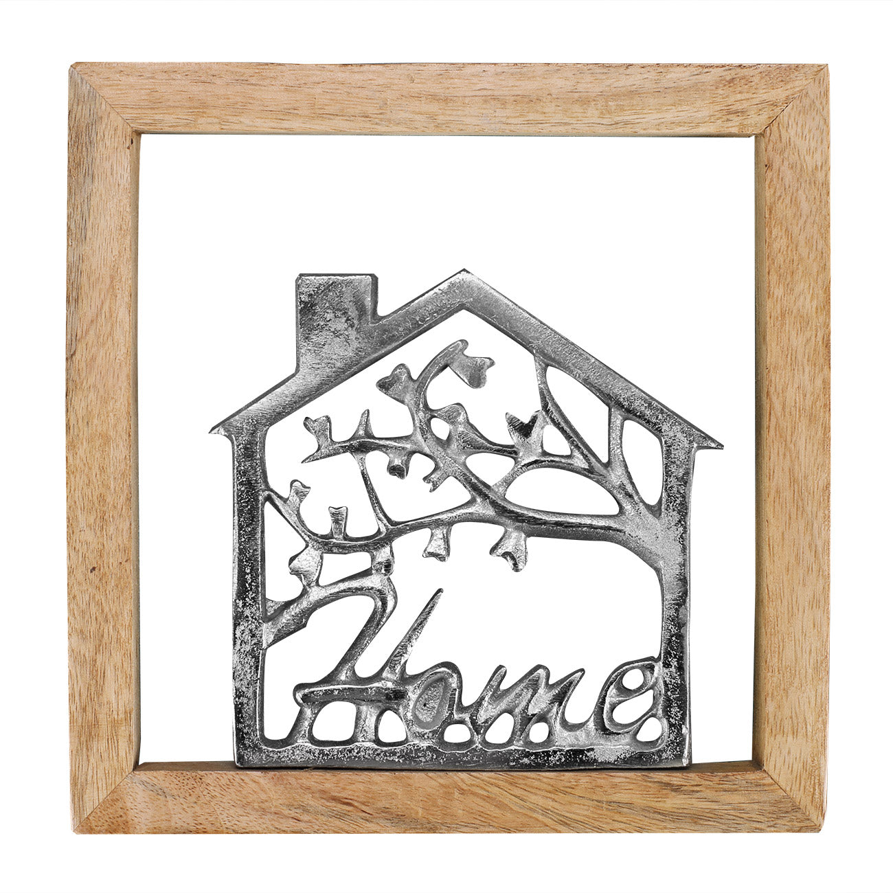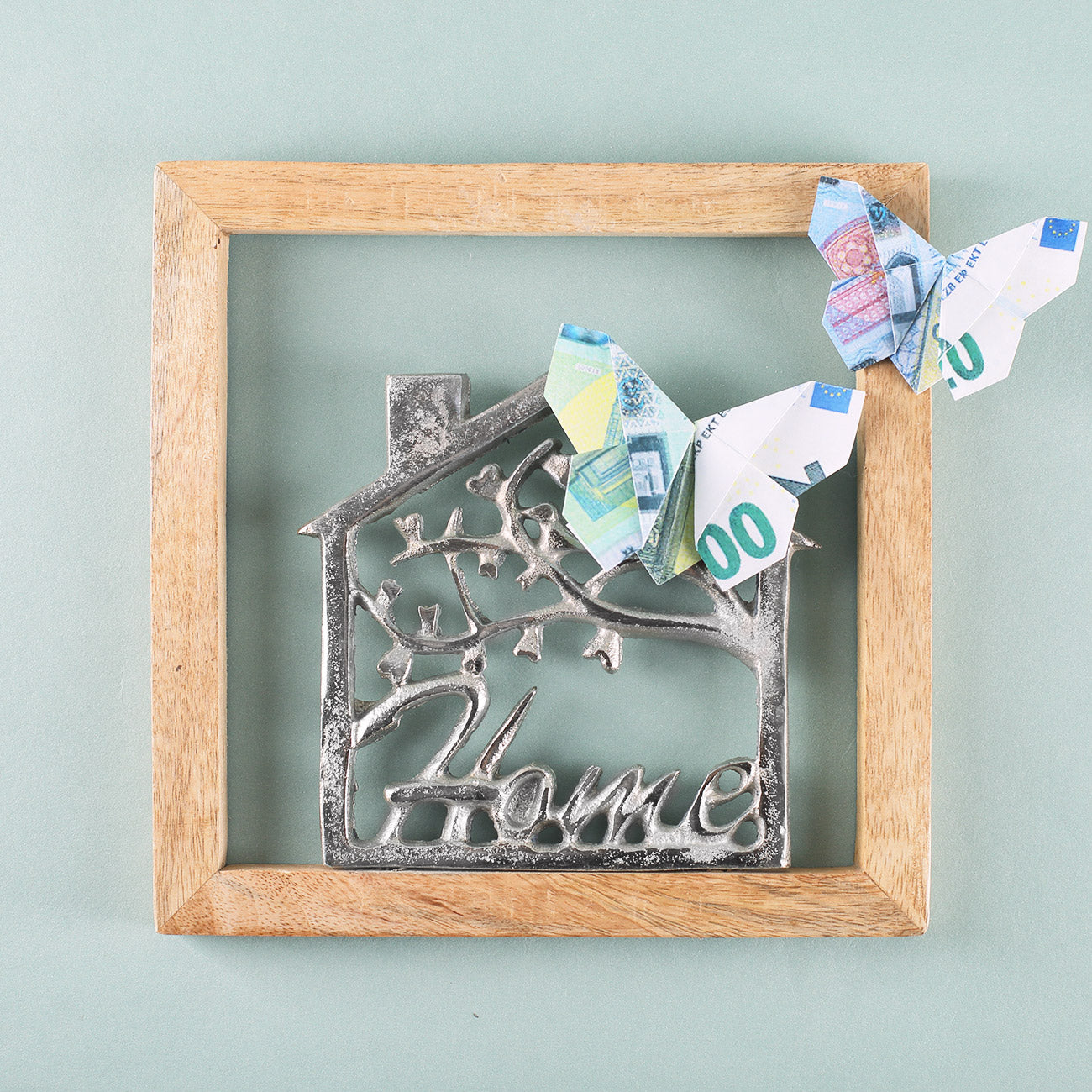 Ein wunderschönes Geschenk zum Einzug & Hausbau ist dieses silberne Haus in einem edlen Holzrahmen. Das Haus mit dem "Home"-Schriftzug besteht aus glänzendem Aluminium und der Holzrahmen aus einem ansprechenden Mangoholz. Mit der praktischen Aufhängung kann diese Wanddeko einfach an jedem beliebigen Ort angebracht werden. Möchten Sie das Geschenk zum Einzug oder Hausbau mit einem Geldgeschenk ergänzen, dann können Sie die Geldscheine schön falten und am Rahmen oder dem Haus selbst anbringen.