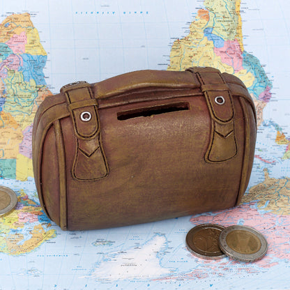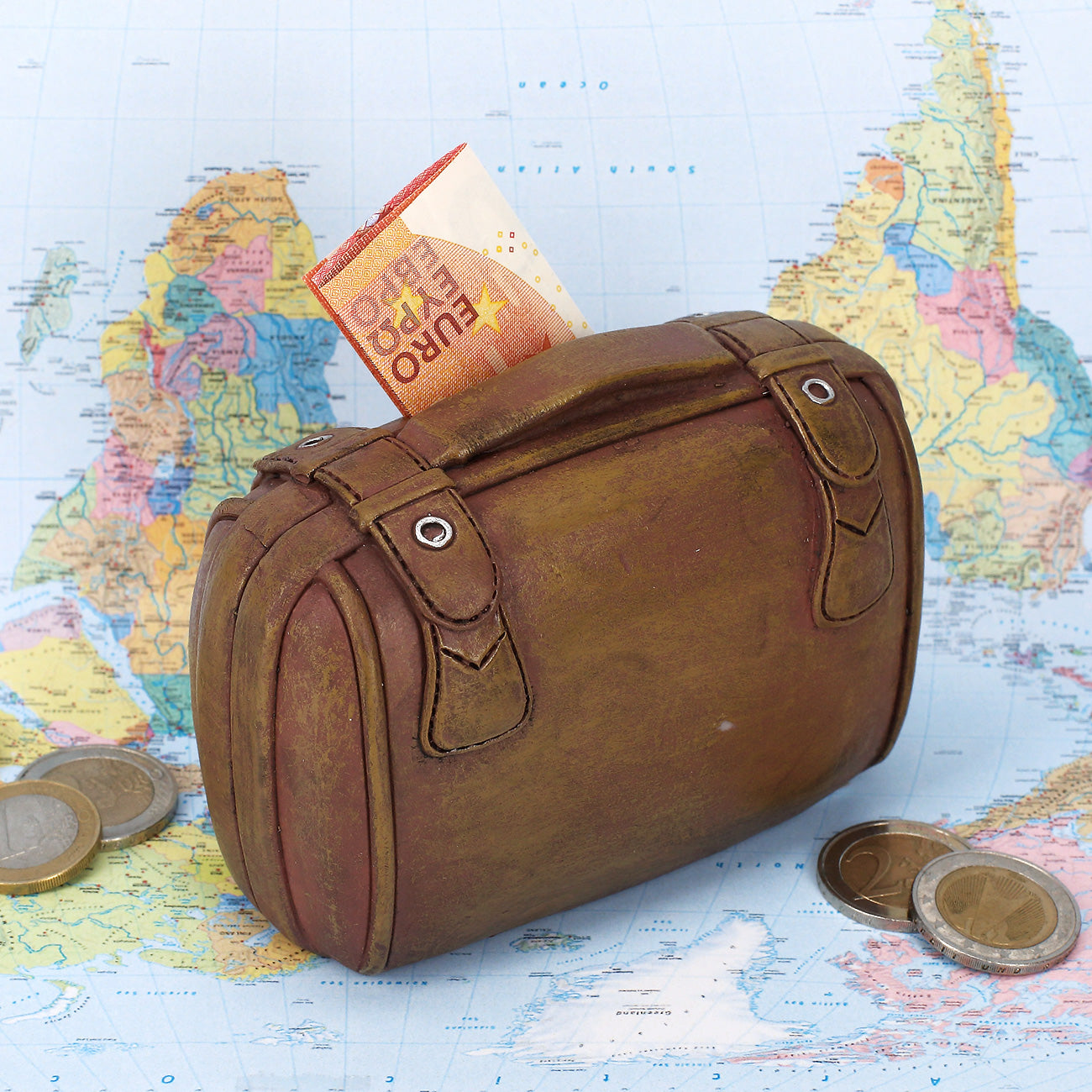 Je nachdem, wie dick bepackt diese Koffer-Spardose ist, fällt womöglich auch das Reiseziel aus. Der braune Koffer eignet sich ideal als Geschenk für Reisebegeisterte, die noch finanzielle Polster aufbauen möchten, bevor es sie wieder durch das Land zieht.