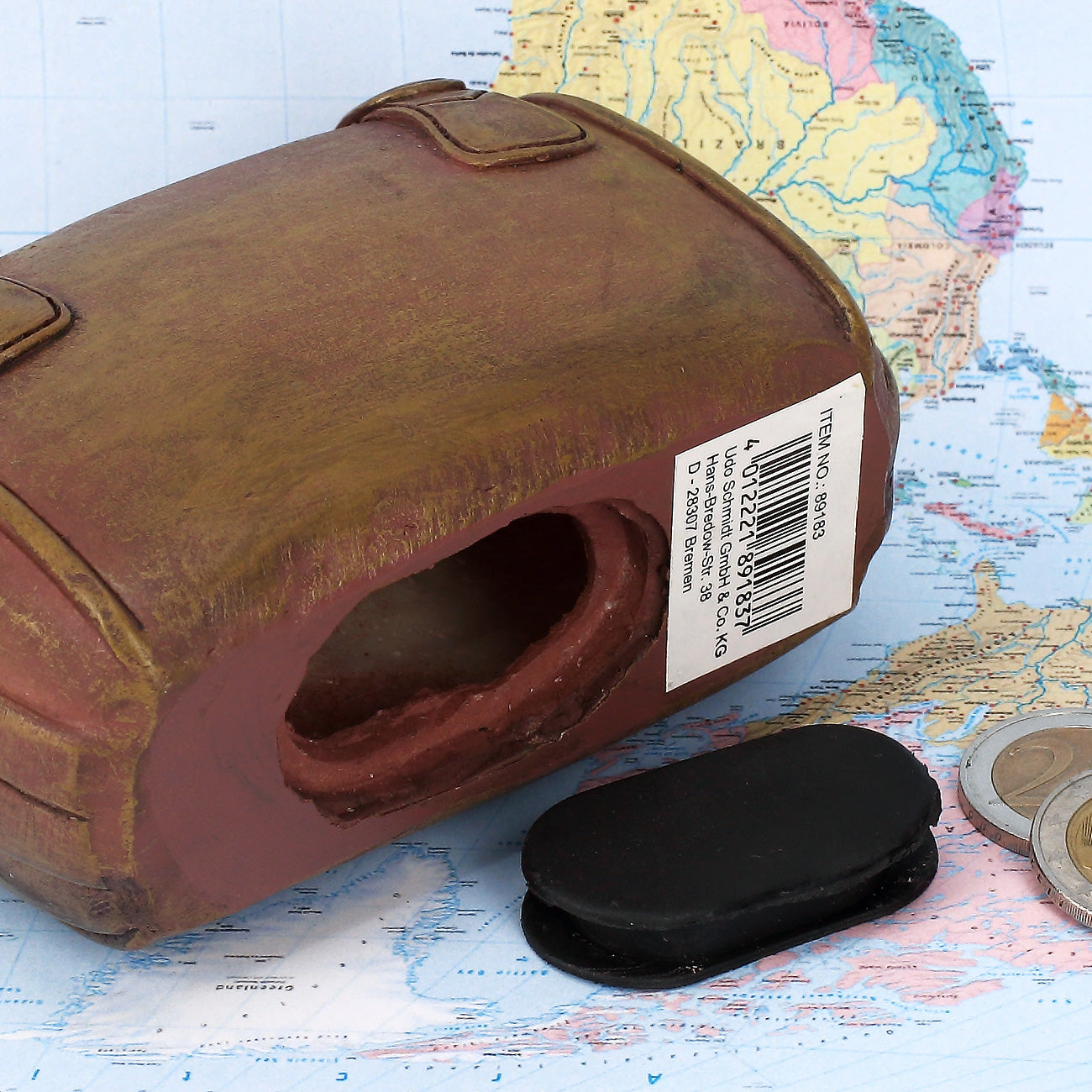 Überraschend echt sieht der Koffer aus, bei dem das Geld über den oberen Schlitz eingesteckt, über den Gummistöpsel wieder entnommen werden kann.