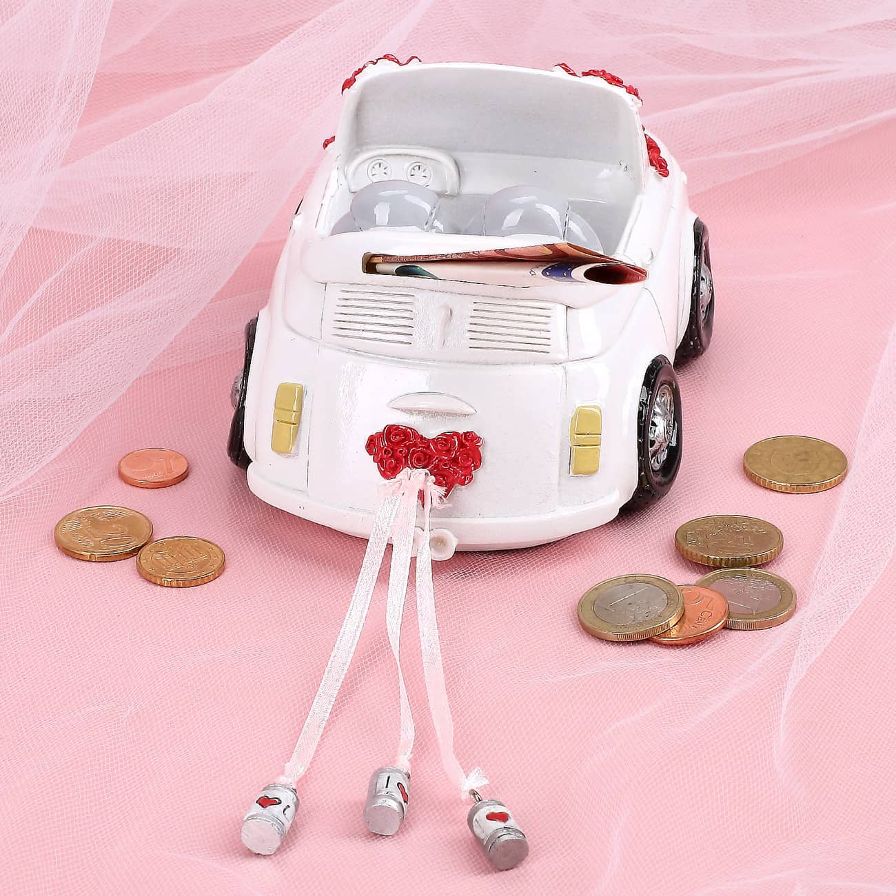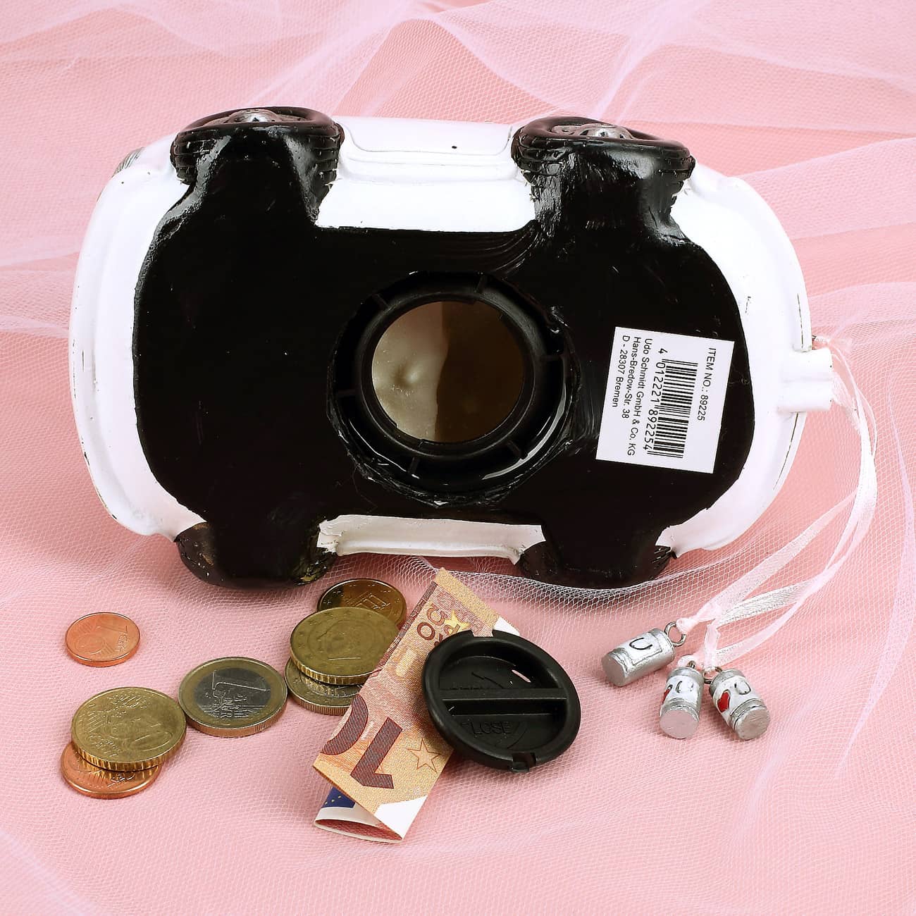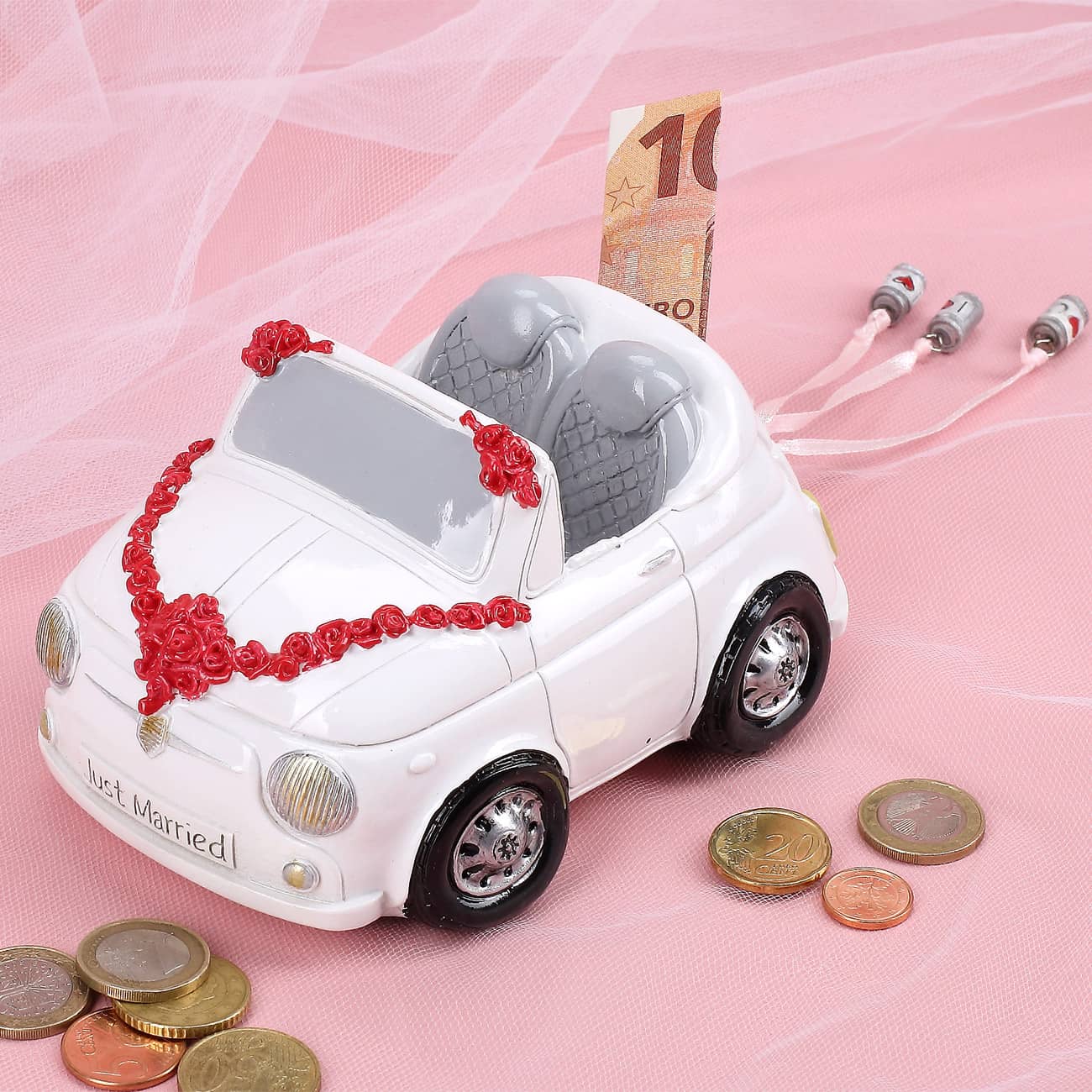 An dem Zweisitzer-Cabrio kann sich das Brautpaar nicht nur optisch erfreuen: im Kofferraum des Autos befindet sich genügend Platz, um das Hochzeitsgeld zu verstauen! Um keine langweilige Karte mit Geld zu füllen, bietet das Auto somit eine etwas besondere Möglichkeit eines Geldgeschenks zur Hochzeit!