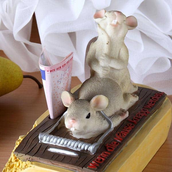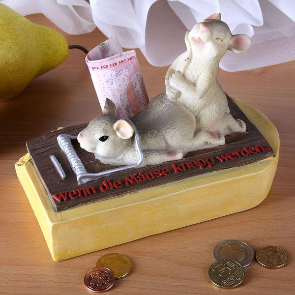 Mit dieser Spardose als Geschenk werden Sie sicher einen Volltreffer landen, vor allem wenn sie gut gefüllt ist, denn über kleine Reserven freut sich jeder. Die Spardose ist aus Polyresin, hat eine Breite von 17 cm und eine Höhe von ca. 12,5 cm. Die Spardose ist in der Form eines Käsestücks gestaltet, auf dem eine Mausefalle und zwei Mäuse stehen. Eine der Maus ist in der Falle gefangen, die andere sitzt dahinter und freut sich.