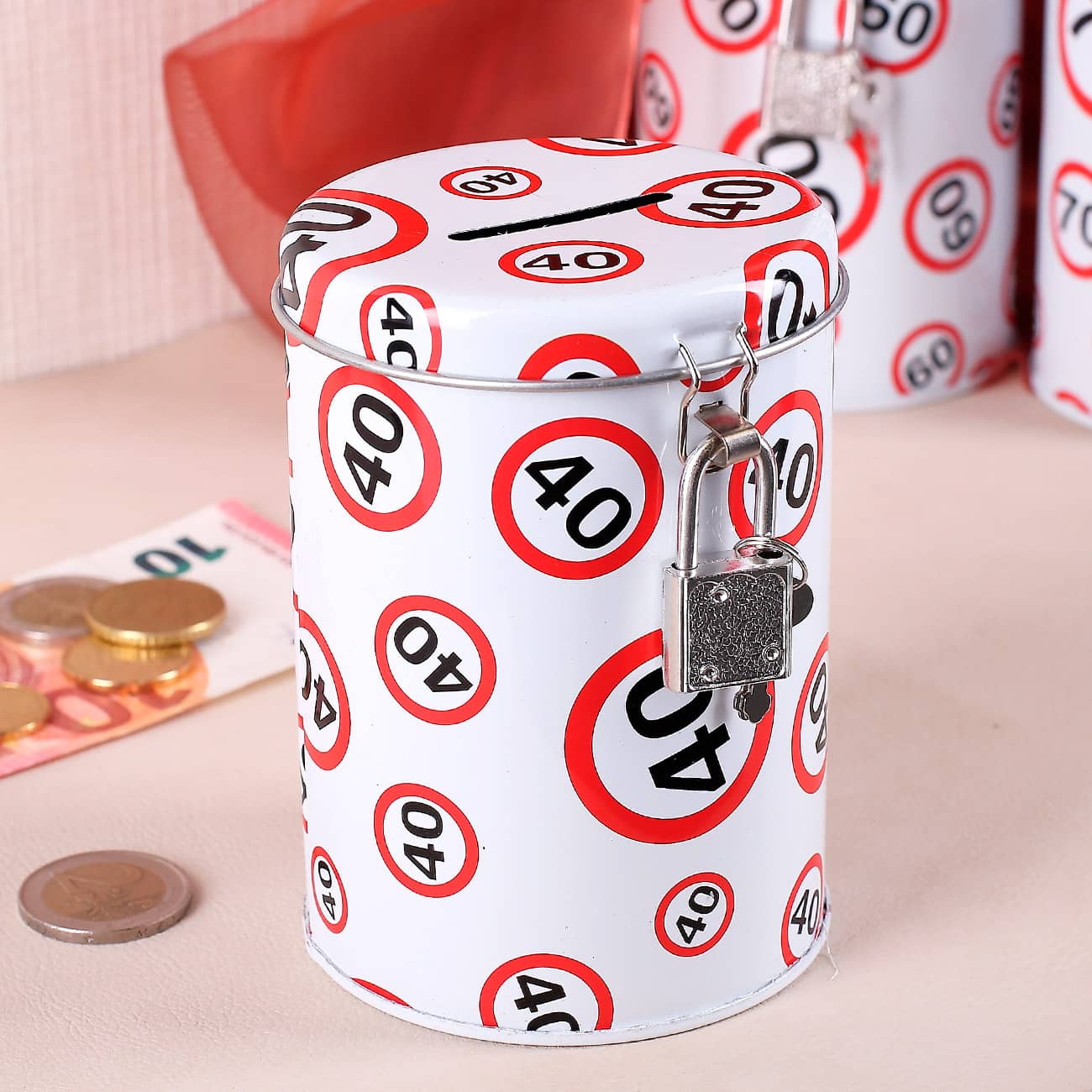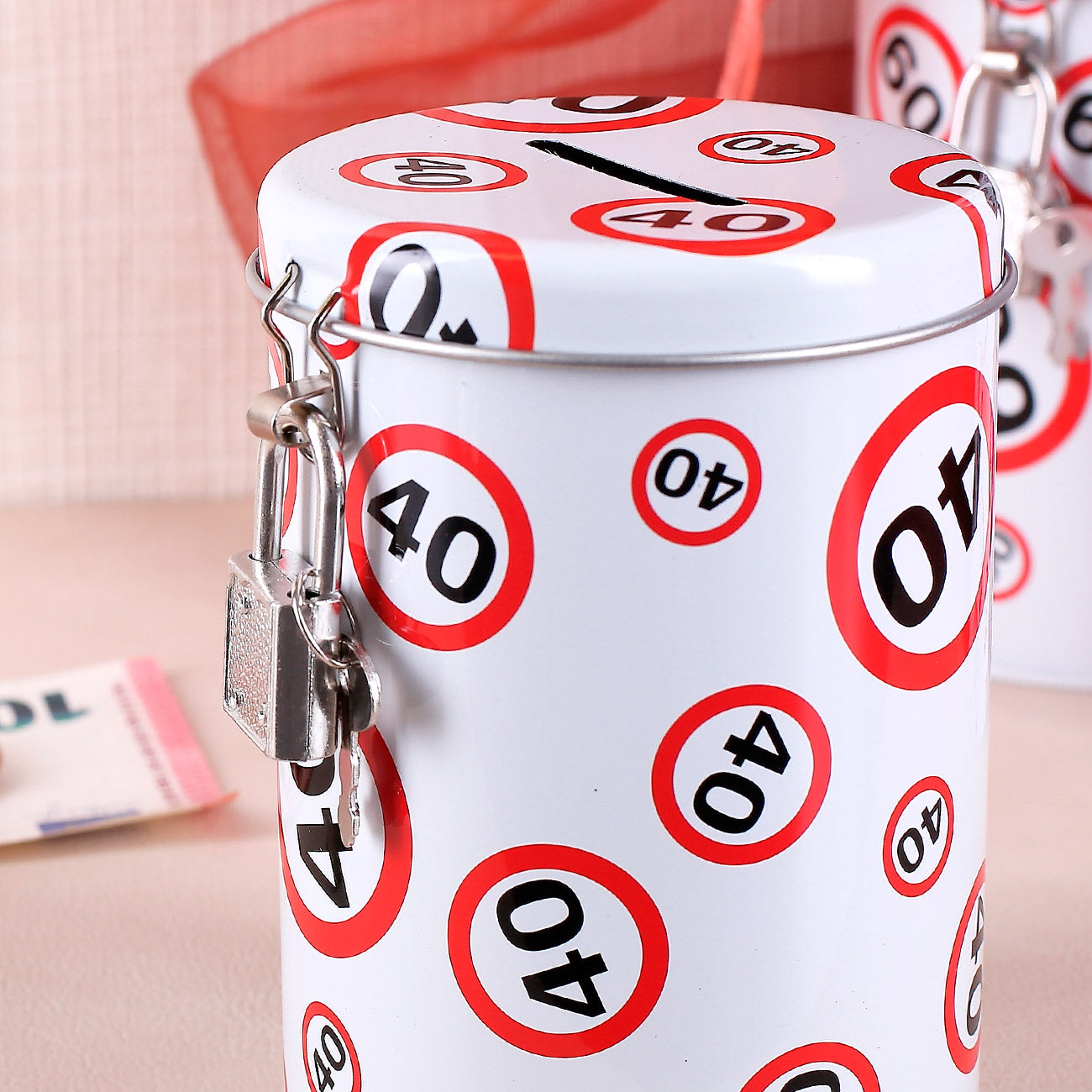 Überraschen Sie das Geburtstagskind mit einem originellen Geldgeschenk, denn darüber freut sich der Beschenkte ganz bestimmt. Geld muss nämlich nicht immer in einer schnöden Karte mit Briefumschlag überreicht werden. Diese Spardose aus Metall mit Schloss ist nicht nur praktisch, sondern sticht auch sofort ins Auge. Die Dose aus Metall ist mit vielen kleinen Verkehrszeichen zum 40. Geburtstag bedruckt. Der Deckel der Dose ist aufklappbar und kann mithilfe eines Schlosses und den beiden Schlüsseln verschlossen werden. So ist das Geld immer sicher verstaut. Auf dem Deckel befindet sich ein Schlitz in den das Geld hinein gesteckt werden kann.