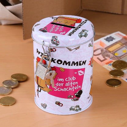 Die Metalldose mit aufklappbaren Deckel ist eine perfekte Geschenkidee um die Beschenkte in den Club der alten Schachteln aufzunehmen. Der Schlitz zum Geldeinwurf befindet sich am Deckel der ganz leicht und einfach mit einem Vorhängeschloss abgenommen werden kann. Somit kann das Geld sicher verstaut werden. Verziert ist die hübsche Spardose mit mit mehreren Geschenkfrauen, Geldbündeln, Würfeln und der Aufschrift Willkommen im Club der alten Schachteln.