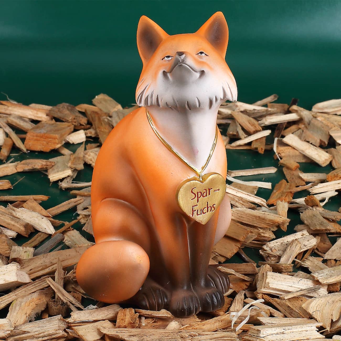 Ein Fuchs müsste man sein! Clever, schnell und zielstrebig – so wie dieser schlaue Sparfuchs! Denn auch das scheint ein Talent der Tiere mit dem orangefarbigen Fell zu sein: Geld sparen! Dieses Tier hat dafür sogar extra eine Kette um den Hals gelegt bekommen: auf dem herzförmigen Anhänger steht groß „Sparfuchs“. Zufrieden schaut der Fuchs deshalb in die Lüfte. In ihm lässt sich nach Belieben der eine oder andere Geldschein stecken – er wird es sicher behüten!