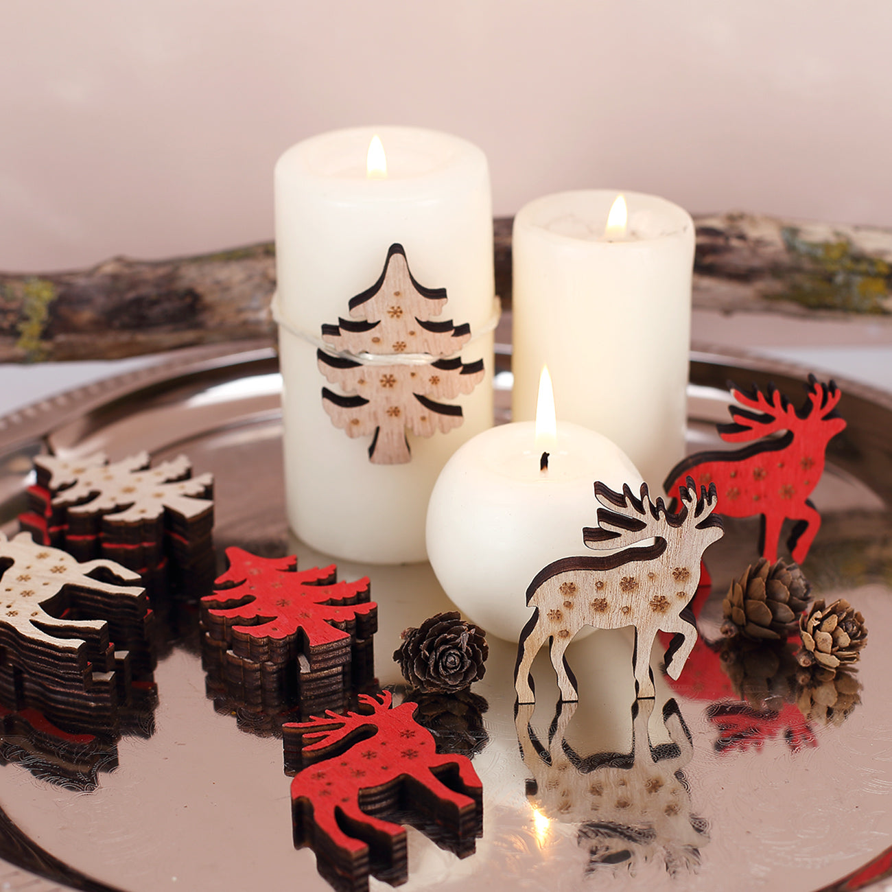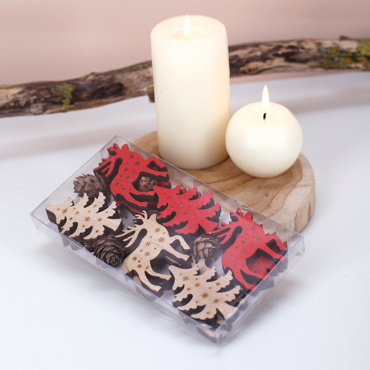 Für eine rundum gelungene Tischdekoration zur gemütlichen Adventszeit sorgt diese Streudeko, zu der neben roten und naturfarbenen Rentieren auch farblich passende Tannen gehören. Die schlichten Holzaccessoires sind gleichzeitig mit ein paar Schneeflocken versehen – der Winter und Weihnachten können also kommen! Insgesamt zwölf Teile werden zu Ihnen nach Hause geliefert – die auf den Bildern abgebildeten Kerzen sind allerdings nicht im Set enthalten.