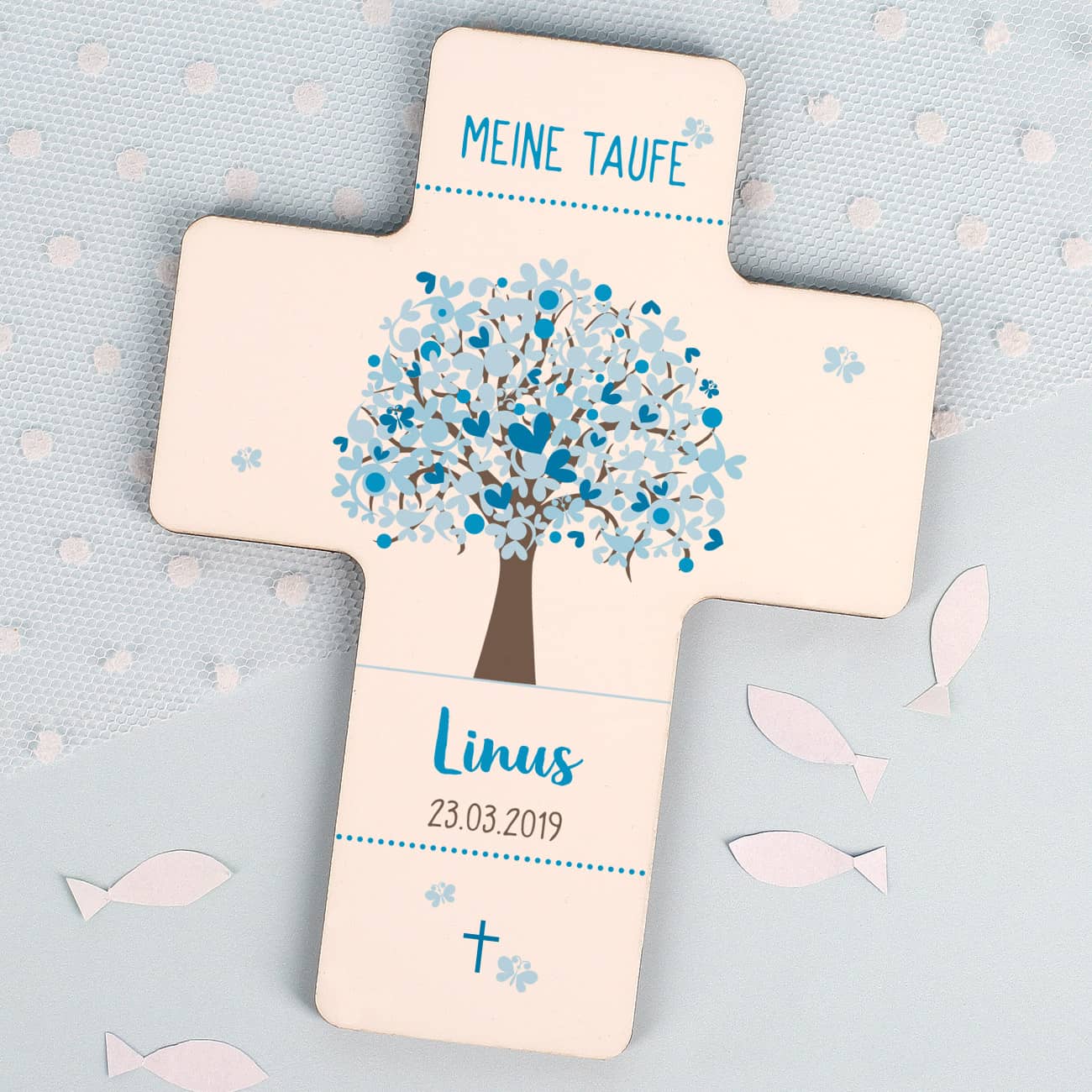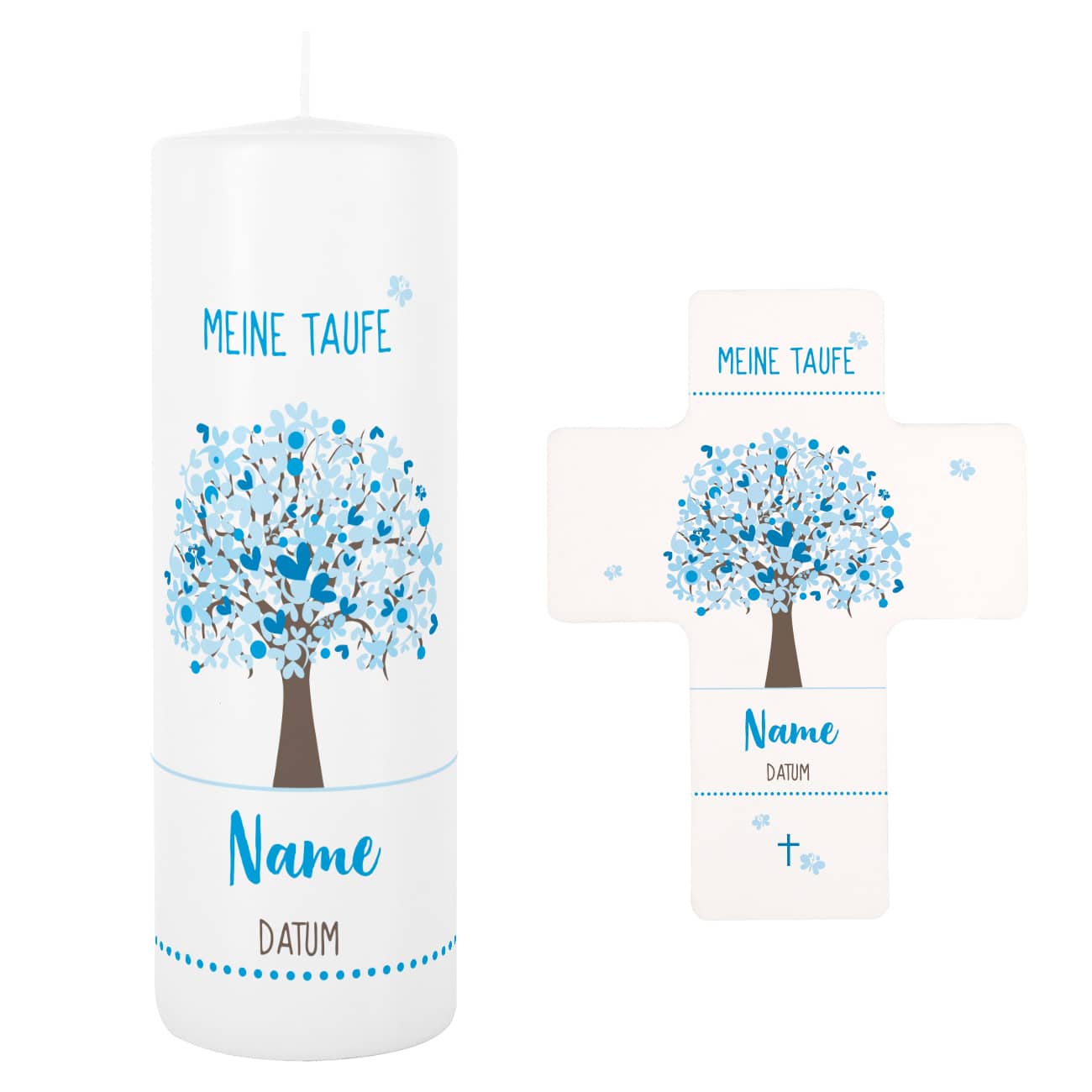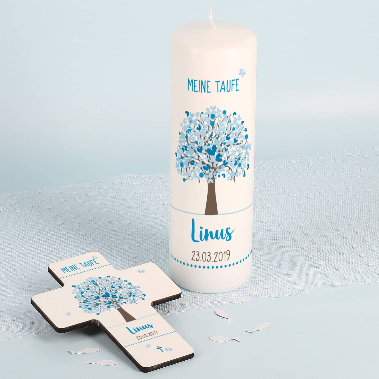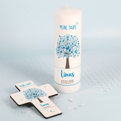 Taufkerze und Kreuz mit Lebensbaum für Jungs