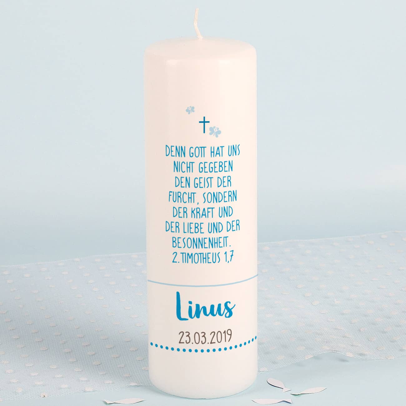 Sie erhalten eine große Kerze aus Echtwachs, die etwa 25 cm hoch ist und einen Durchmesser von 8 cm hat. Die Kerze ist weiß und wird rundherum bedruckt. Vorn ist der Satz "Meine Taufe" zu lesen. Darunter ist ein großer Lebensbaum in verschiedenen Blautönen. Der Name des Täuflings und das Taufdatum finden natürlich auch Platz auf der Kerze. Auf der Rückseite ist noch Platz für Ihren ganz eigenen Taufspruch.
