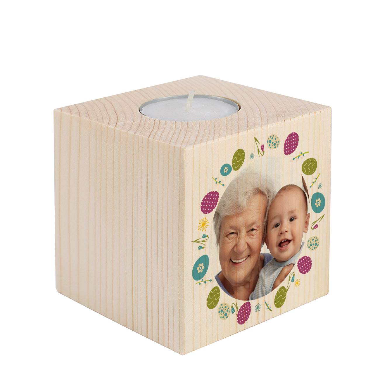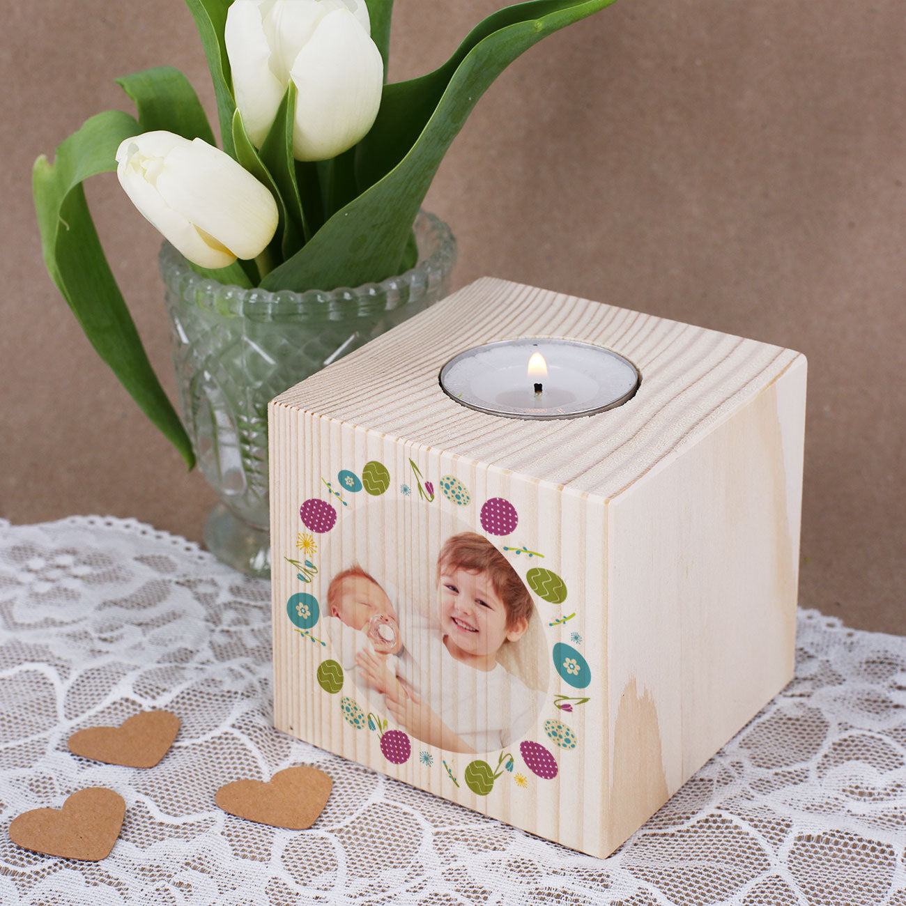 Verschenken Sie Erinnerungen an diesem Osterfest! Unser Teelichthalter wird mit Ihrem schönsten Foto bedruckt! Er besteht zu 100 % aus Holz und hat die Form eines Würfels. Oben ist eine Aussparung für handelsübliche Teelichter vorgesehen.