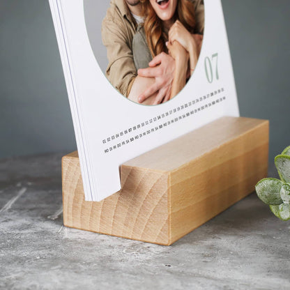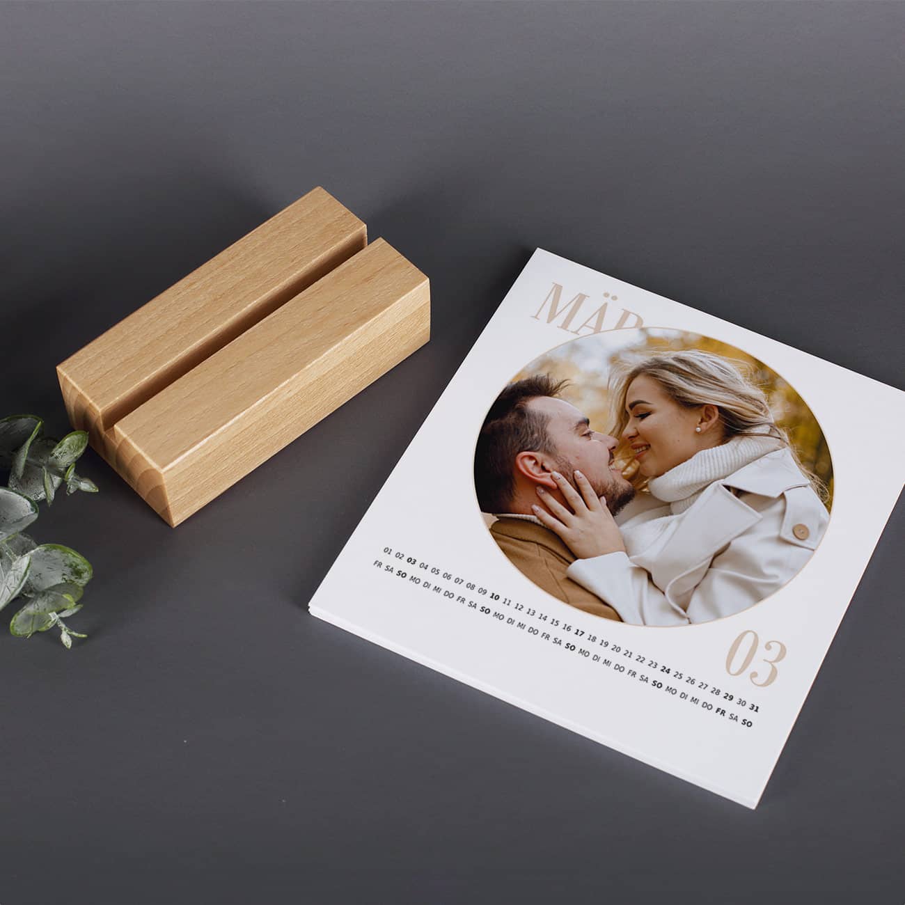 Erleben Sie ein Jahr voller persönlicher Erinnerungen mit unserem modernen Tischkalender, gestaltet mit Ihren individuellen Fotos. Dieser einzigartige Fotokalender in einem außergewöhnlichen Design bietet Platz für insgesamt 13 Seiten, darunter ein Deckblatt, das wir nach Ihren Vorstellungen mit drei Fotos und zwei Zeilen Text in einer Farbe Ihrer Wahl gestalten. Die weiteren Kalenderseiten sind jeweils mit einem Ihrer Wunschfotos bedruckt. Wir haben uns etwas Besonderes einfallen lassen: Die Fotos sind rund, was dem Kalender ein modernes und frisches Aussehen verleiht. Im mitgelieferten Echtholzsockel finden die Kalenderseiten ihren Platz, so dass Sie diesen Fotokalender stilvoll auf einem Regal, einer Kommode oder einem Tisch präsentieren können.