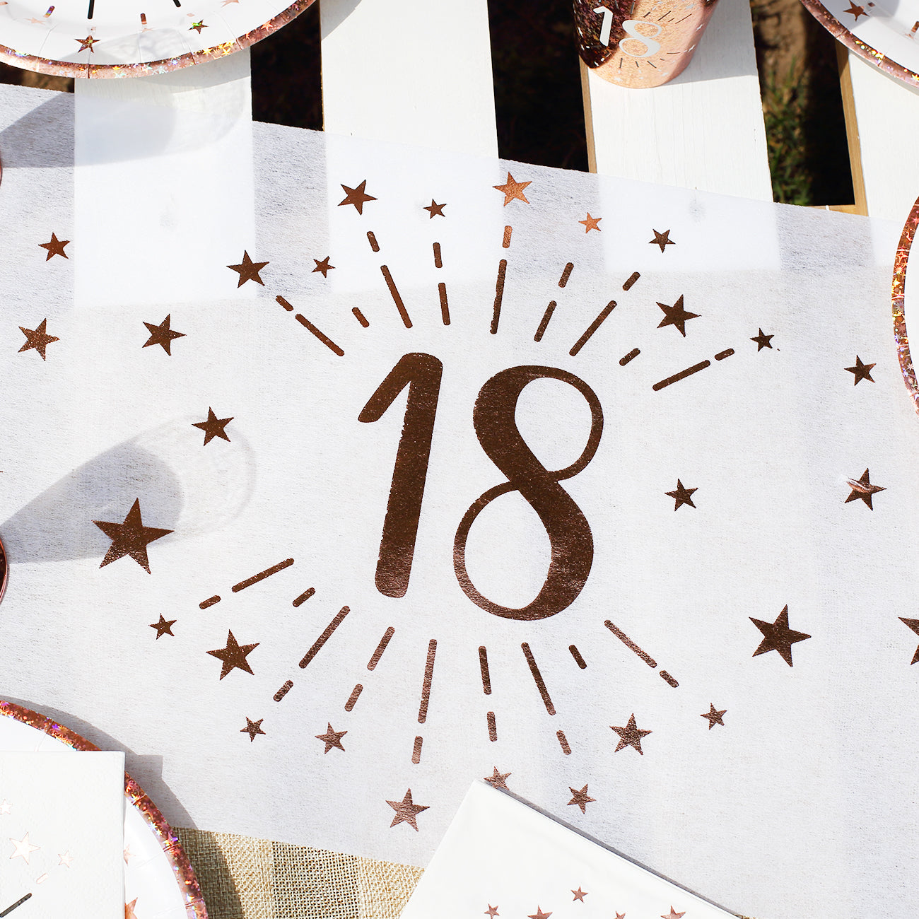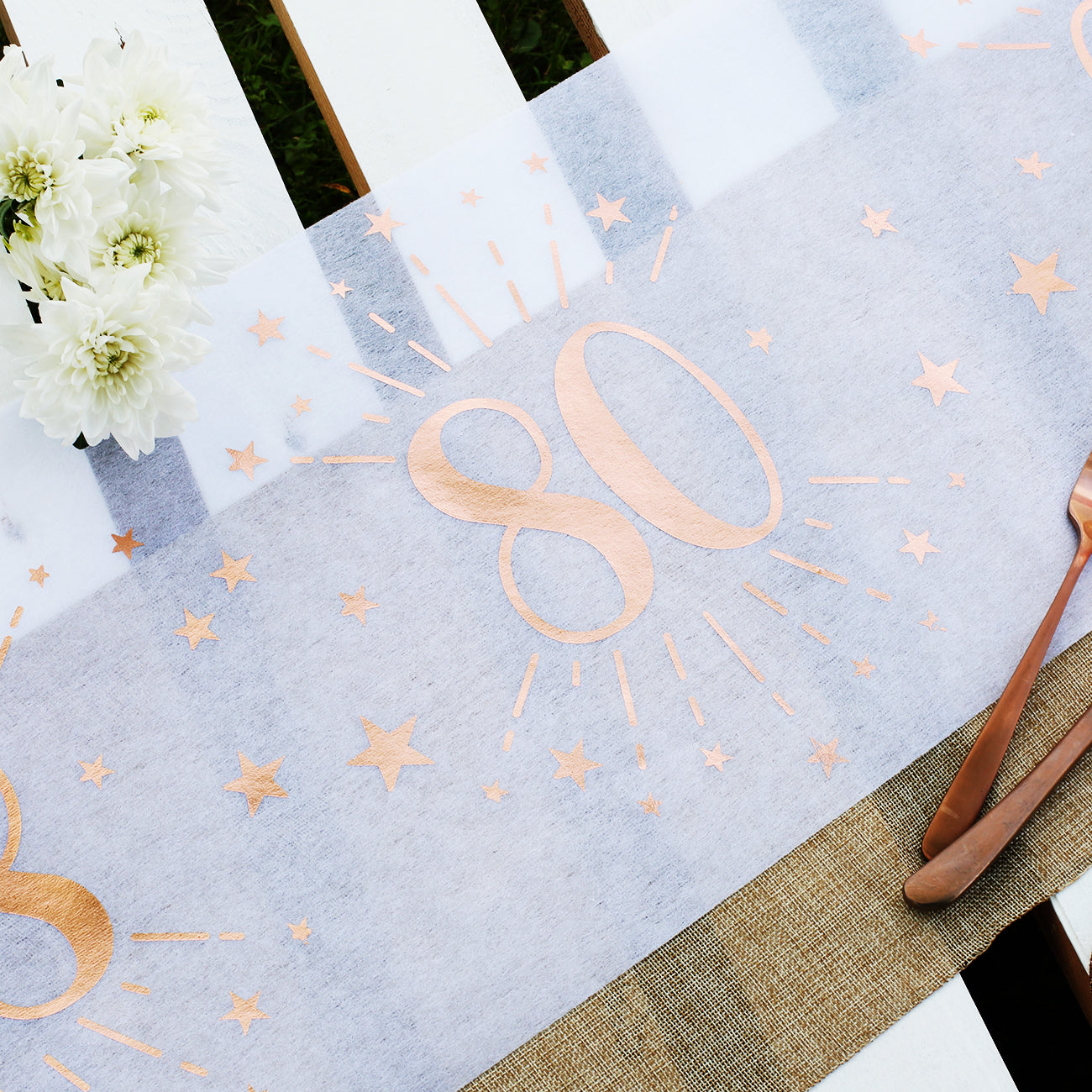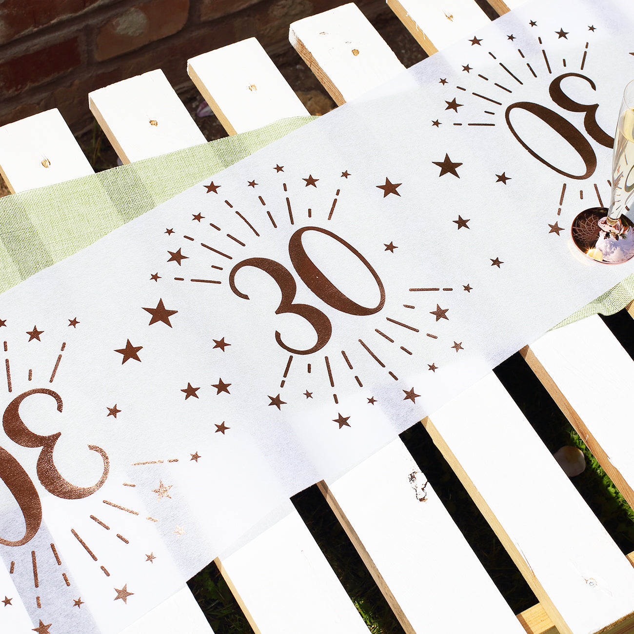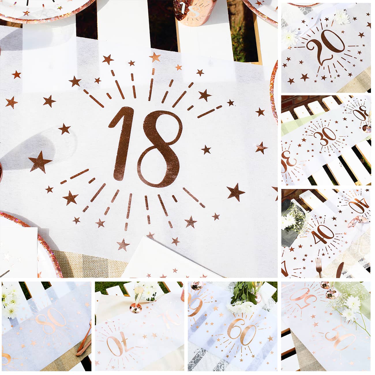 Diese wunderschönen Tischläufer lassen jeden Geburtstagstisch zum Highlight werden. Das weiße Tischband besteht aus feinem Vlies und ist bedruckt mit einer großen roséfarbenen Zahl, umgeben von Sternen, glänzt Sie im Licht.