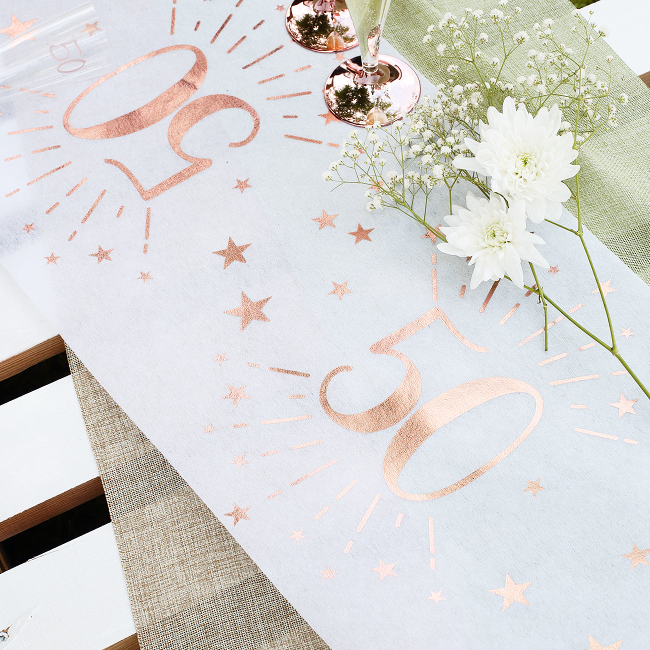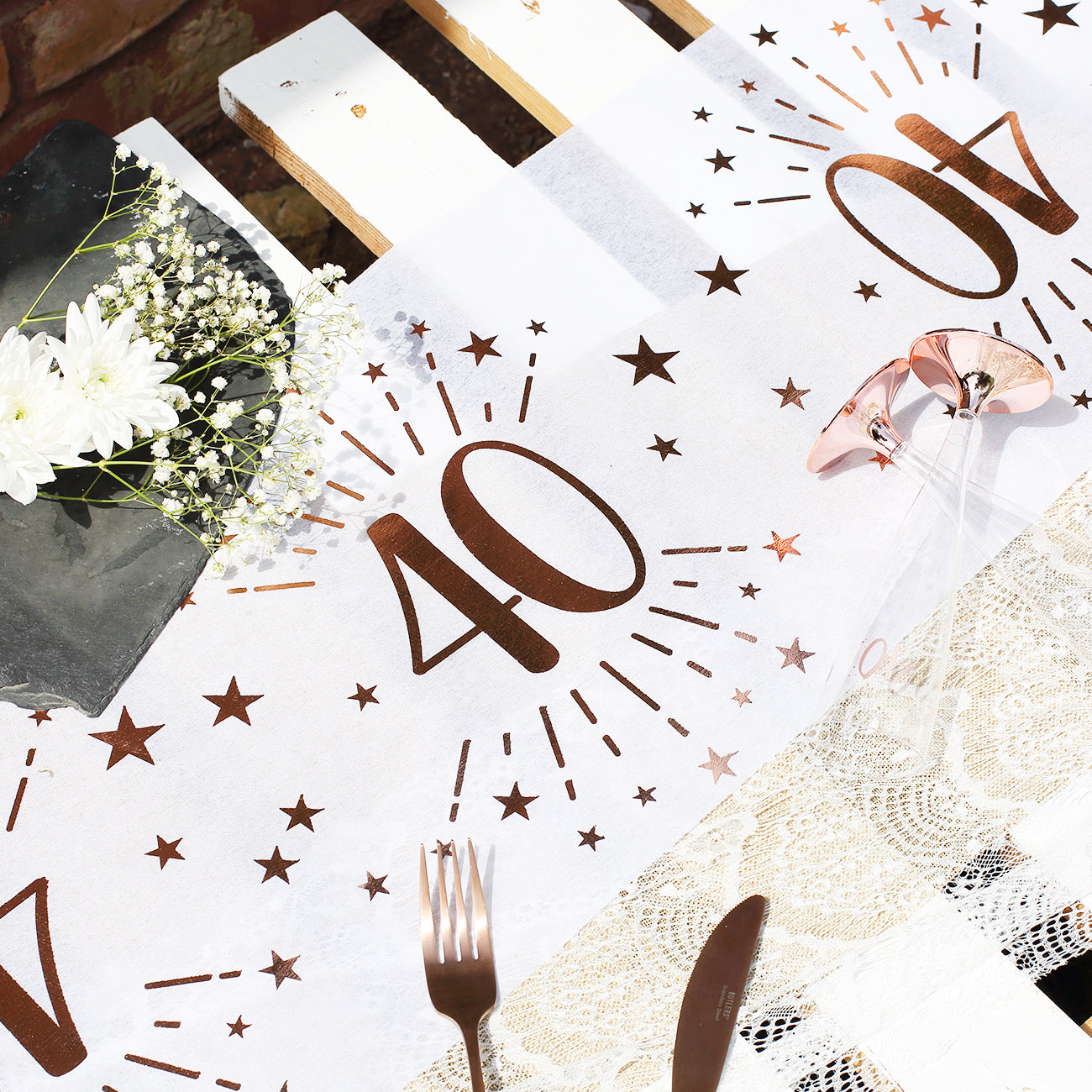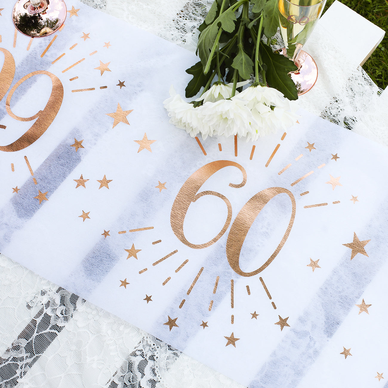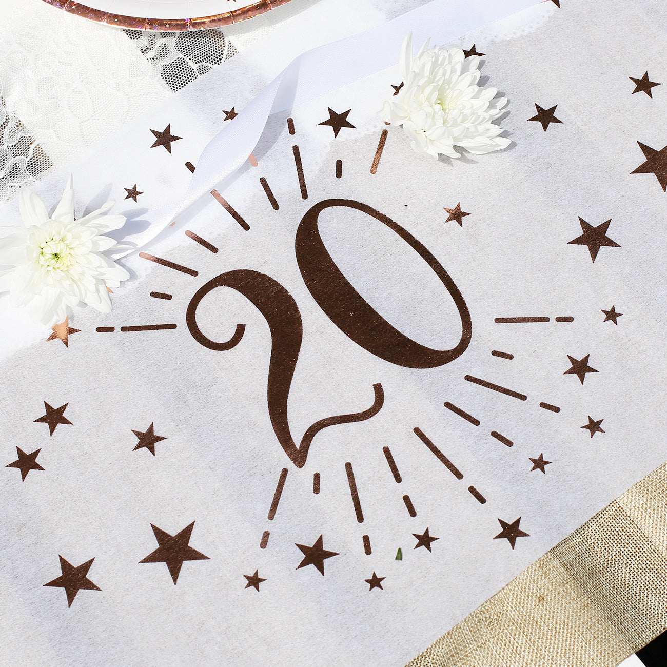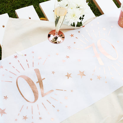 Diese wunderschönen Tischläufer lassen jeden Geburtstagstisch zum Highlight werden. Das weiße Tischband besteht aus feinem Vlies und ist bedruckt mit einer großen roséfarbenen Zahl, umgeben von Sternen, glänzt Sie im Licht.