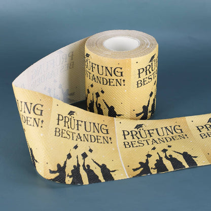 Gratulieren Sie jemanden zu einer bestandenen Prüfung mit diesem bunt bedrucktem Toilettenpapier. Es erhält die Aufschrift "Prüfung bestanden!" und schwarze Umrisse von Personen, die Ihre Absolventenkappe feierlich in die Luft werfen. Aber nicht nur zum Abschluss des Studiums ist dies ein witziges Geschenk. Überreichen Sie das Toilettenpapier auch zum Schulabschluss, wie zum Beispiel zum Abitur, zur bestandenen Führerscheinprüfung oder auch zum Abschluss einer Ausbildung oder Weiterbildung. Wunderbar lässt sich das Toilettenpapier auch als Dekoration für die Party verwenden.