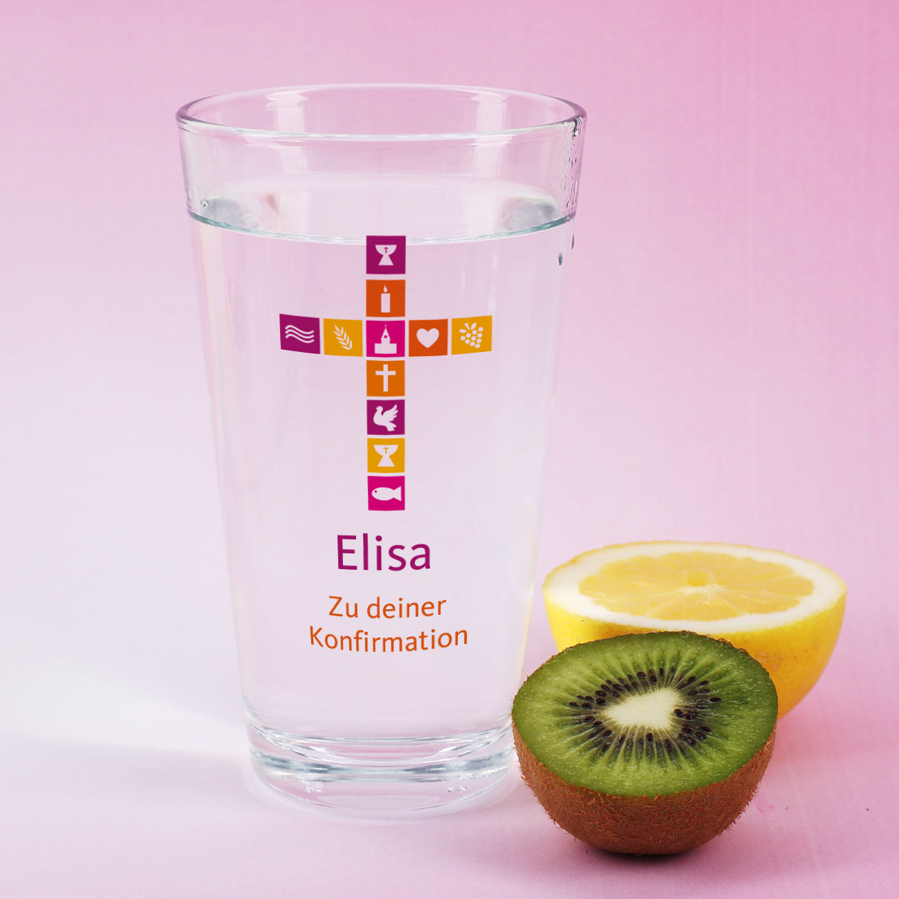Trinkglas zur Kommunion oder Konfirmation mit Kreuz, Name und Wunschtext