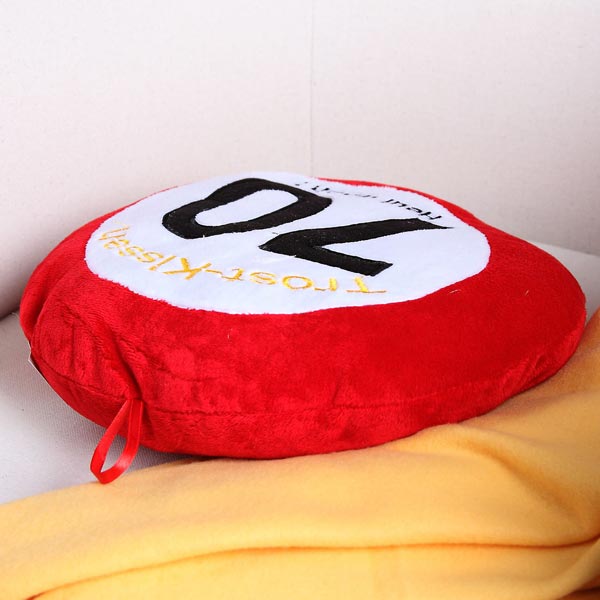 Das runde Kissen ist im Design eines Verkehrszeichen gestaltet und hat auf seiner Vorderseite die Aufschrift Trost-Kissen 70 Heul doch gestickt. Auf der Rückseite ist das Kissen rot und kann mit einem angenähten Band problemlos aufgehängt werden. Das ganze Kissen besteht aus kuscheligem Plüsch, wodurch es sich besonders gut als Trostspender eignet. Bei zu häufiger Benutzung kann das Kissen auch bei 30 Grad problemlos gewaschen werden.