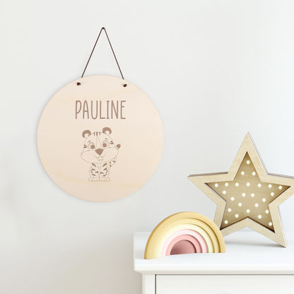 Türschild aus Holz mit Tiger-Motiv und Wunschname fürs Kinderzimmer