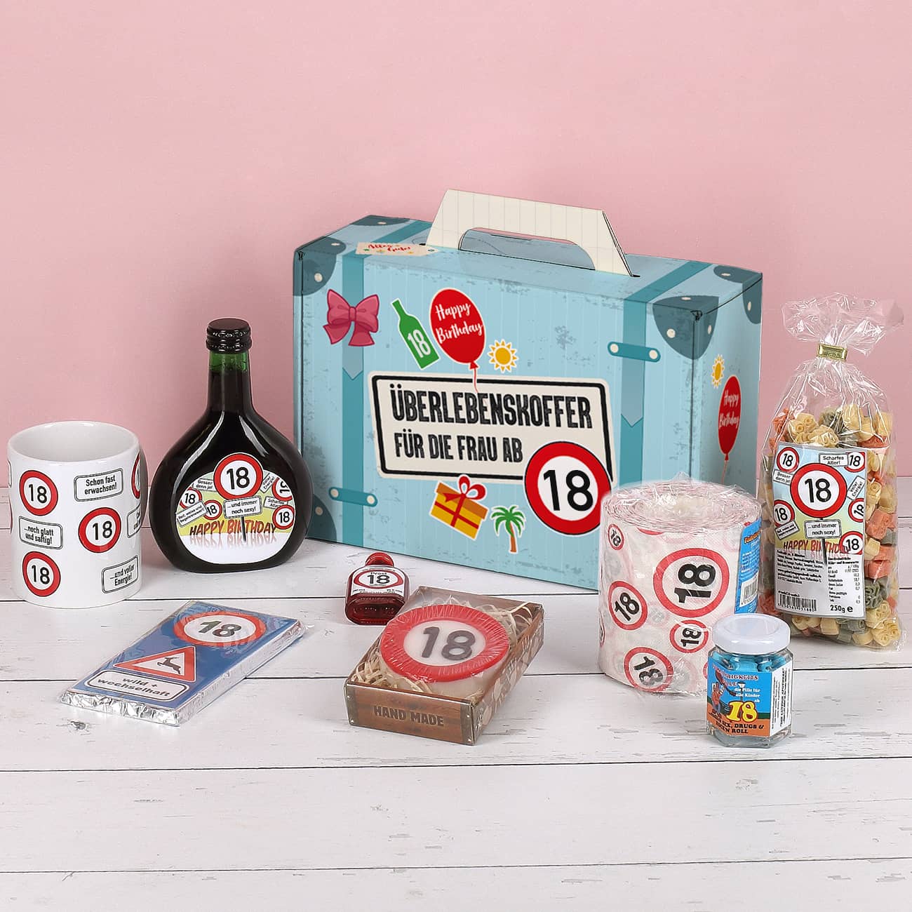 Endlich 18 und die weite Welt ruft! Damit das Geburtstagskind auch für alle Eventualitäten gewappnet ist, wenn es auf eigenen Beinen steht, ist dieses Survivalkit einfach unerlässlich. Der Koffer ist prall gefüllt mit witzigen und praktischen Sachen die das Leben schöner machen.