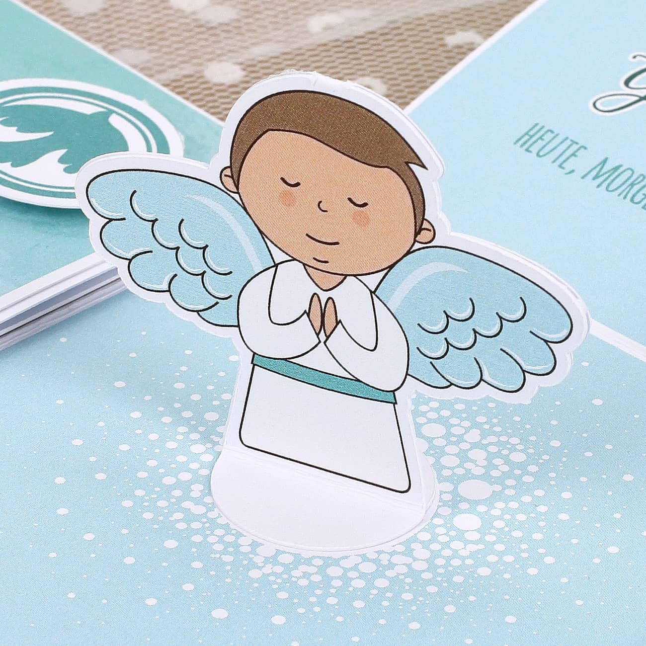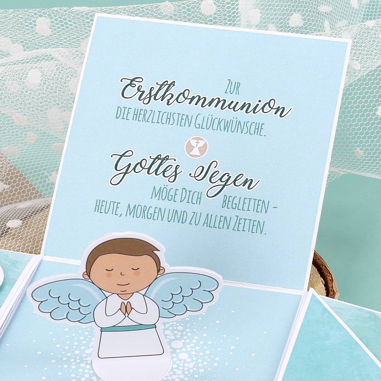 Auf dem Deckel der Box steht der Schriftzug "Herzliche Glückwünsche zu deiner Kommunion" in Kombination mit dem Namen des Kindes. Das Besondere der Überraschungsbox beginnt aber erst, wenn der Deckel abgenommen wird. Dann fallen die Seitenteile herunter und der Blick auf den liebevoll gestalteten Innenteil wird frei. Dort befinden sich neben einem betenden Engel ein Glückwunschtext sowie der Spruch "Gottes Segen möge dich begleiten - heute, morgen und zu allen Zeiten."