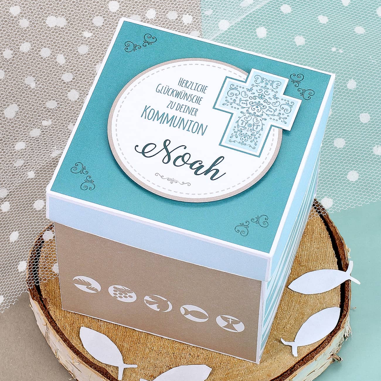 Geldgeschenke und Gutscheine sind ein gern gesehenes Geschenk zur Kommunion. Mit dieser Überraschungsbox erhält Ihr Geldgeschenk eine würdige Verpackung zu einem ganz besonderen Anlass. Ergänzt mit persönlichen Wünschen wird die Geschenkbox eine schöne Aufmerksamkeit zur ersten heiligen Kommunion.