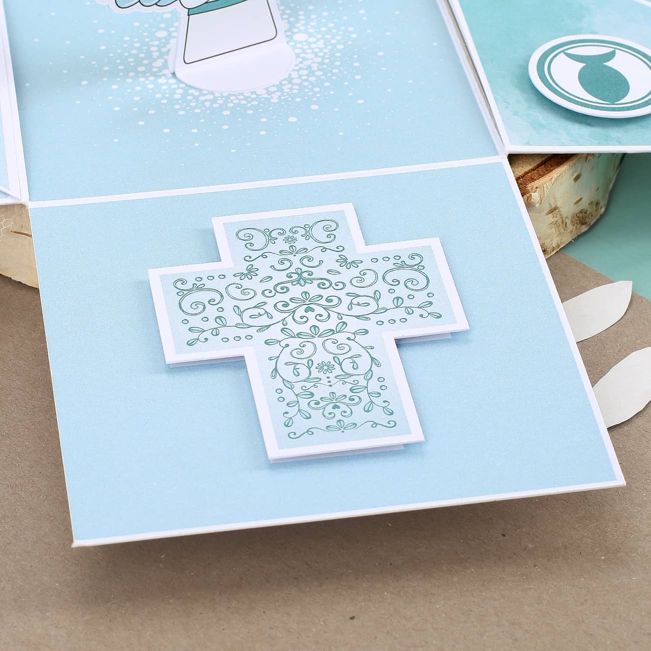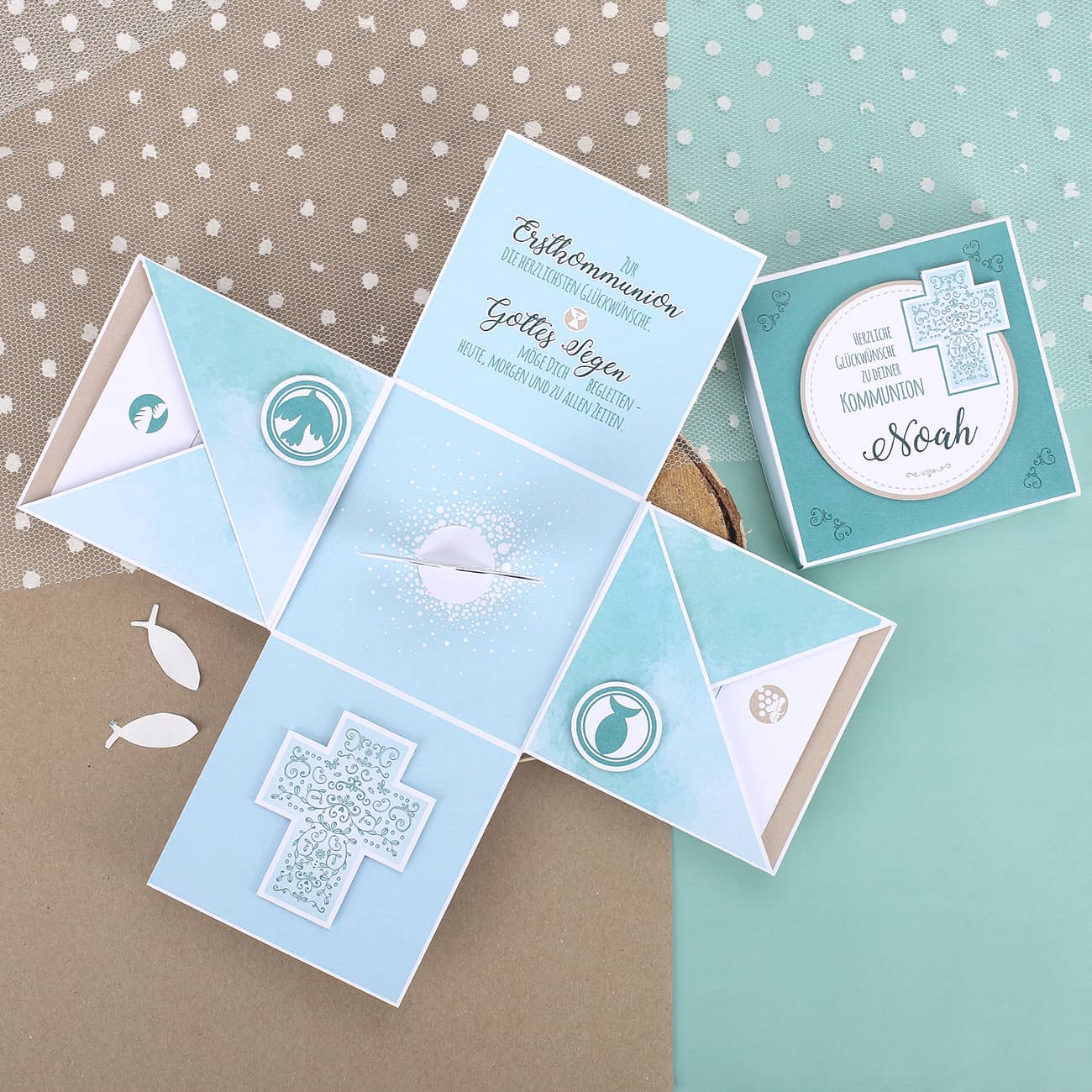 Hellblaue Überraschungsbox zur Kommunion für Geldgeschenke und Gutscheine