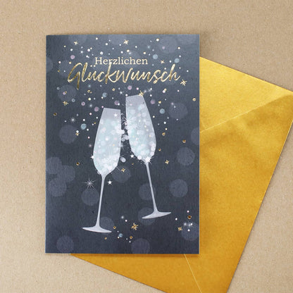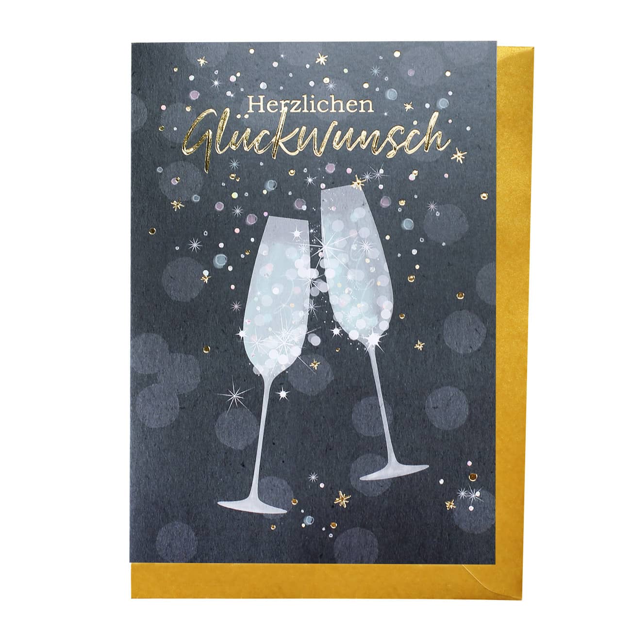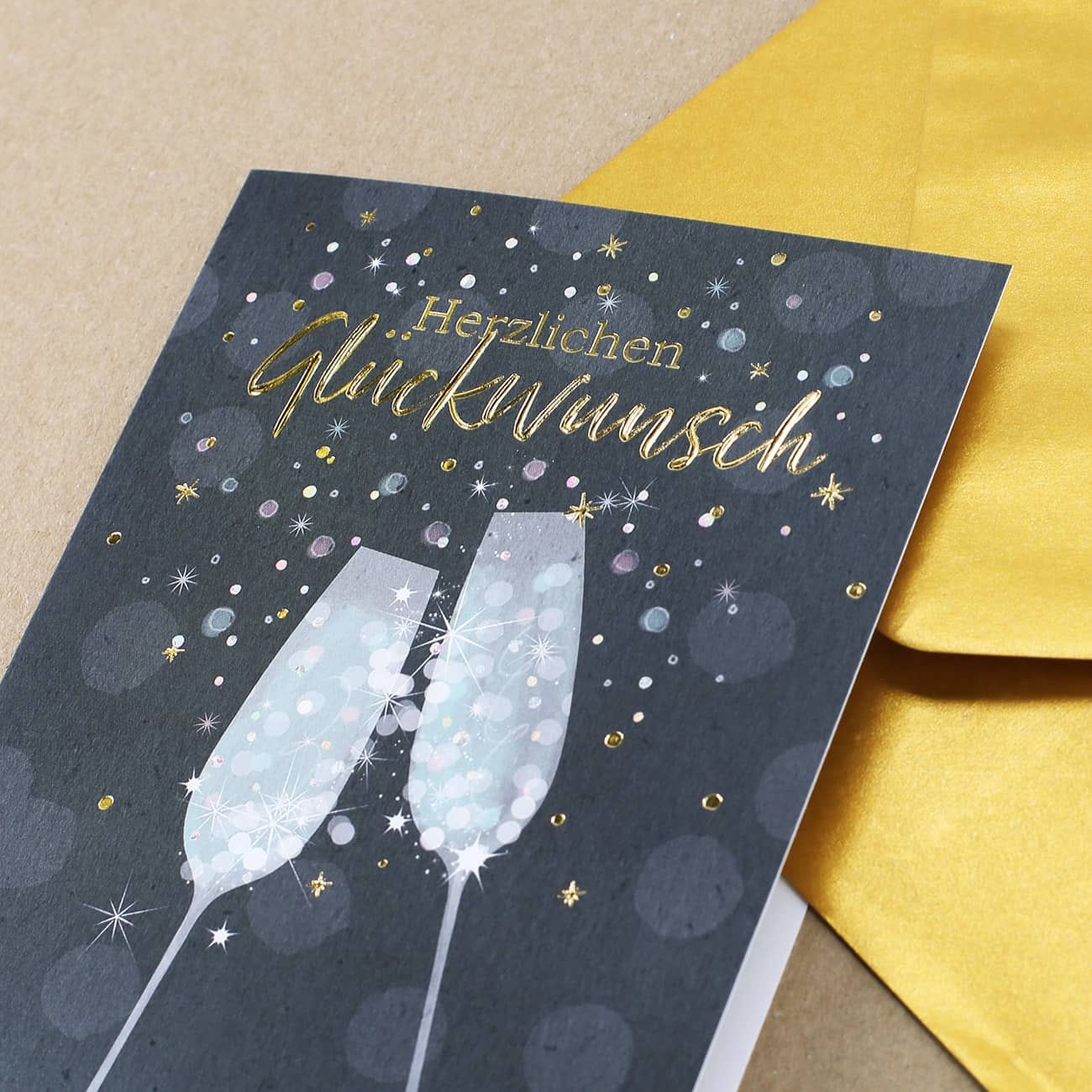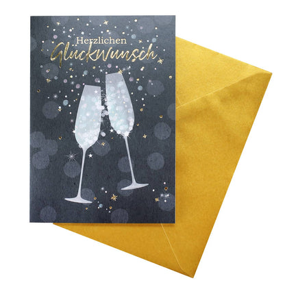 Diese Karte besticht mit Ihrem hochwertigen Design und der goldfarbene Veredelung. Der Hintergrund der Klappkarte ist schwarz und bildet den perfekten Kontrast zu dem goldenen Schriftzug: Herzlichen Glückwunsch. Die Prägung der Schrift sorgt zusätzlich für ein edles Erscheinungsbild. Zwei sprudelnde Sektgläser mit goldene und glänzenden Sternen runden das Bild der Glückwunschkarte ab. Mit dieser hübschen Klappkarte kommen die Glückwünsche mit Sicherheit gut an, egal zu welchem Anlass!