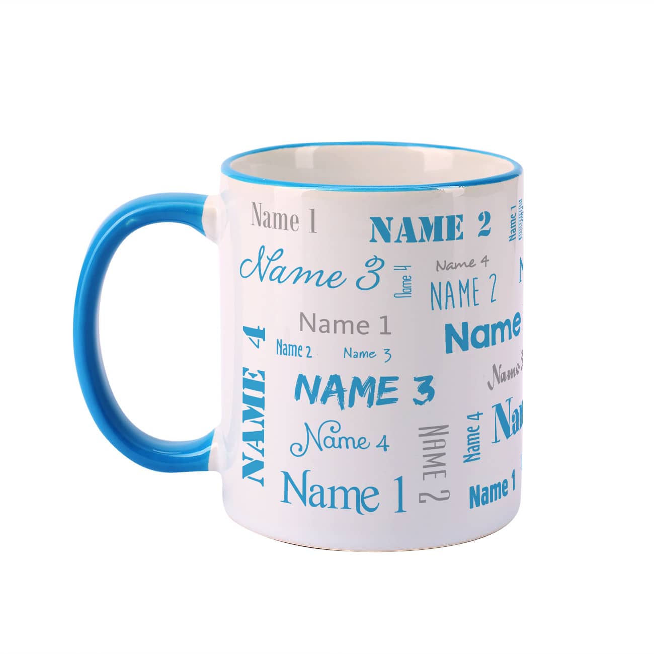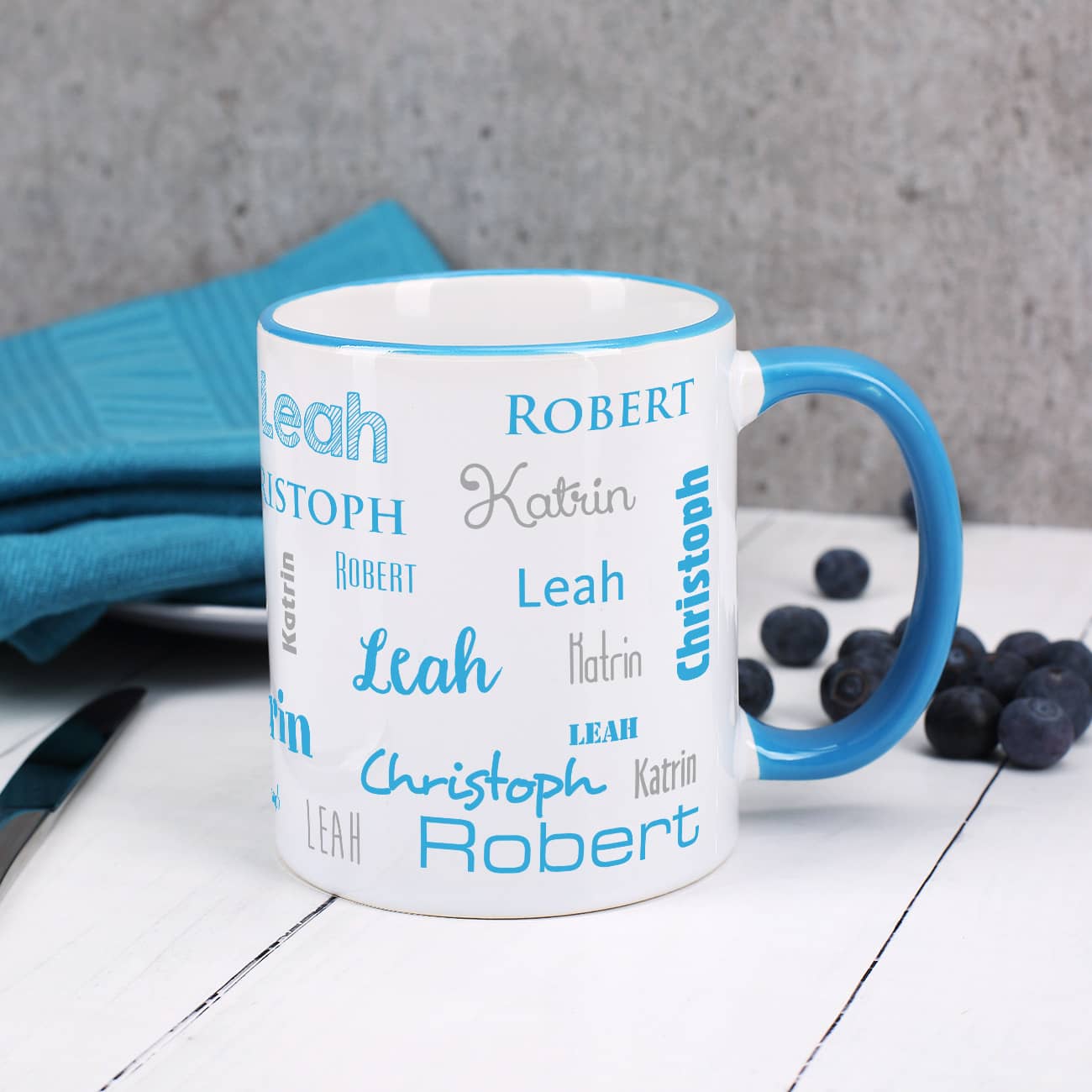 Vier Namen - Familientasse mit hellblauem Rand und Henkel