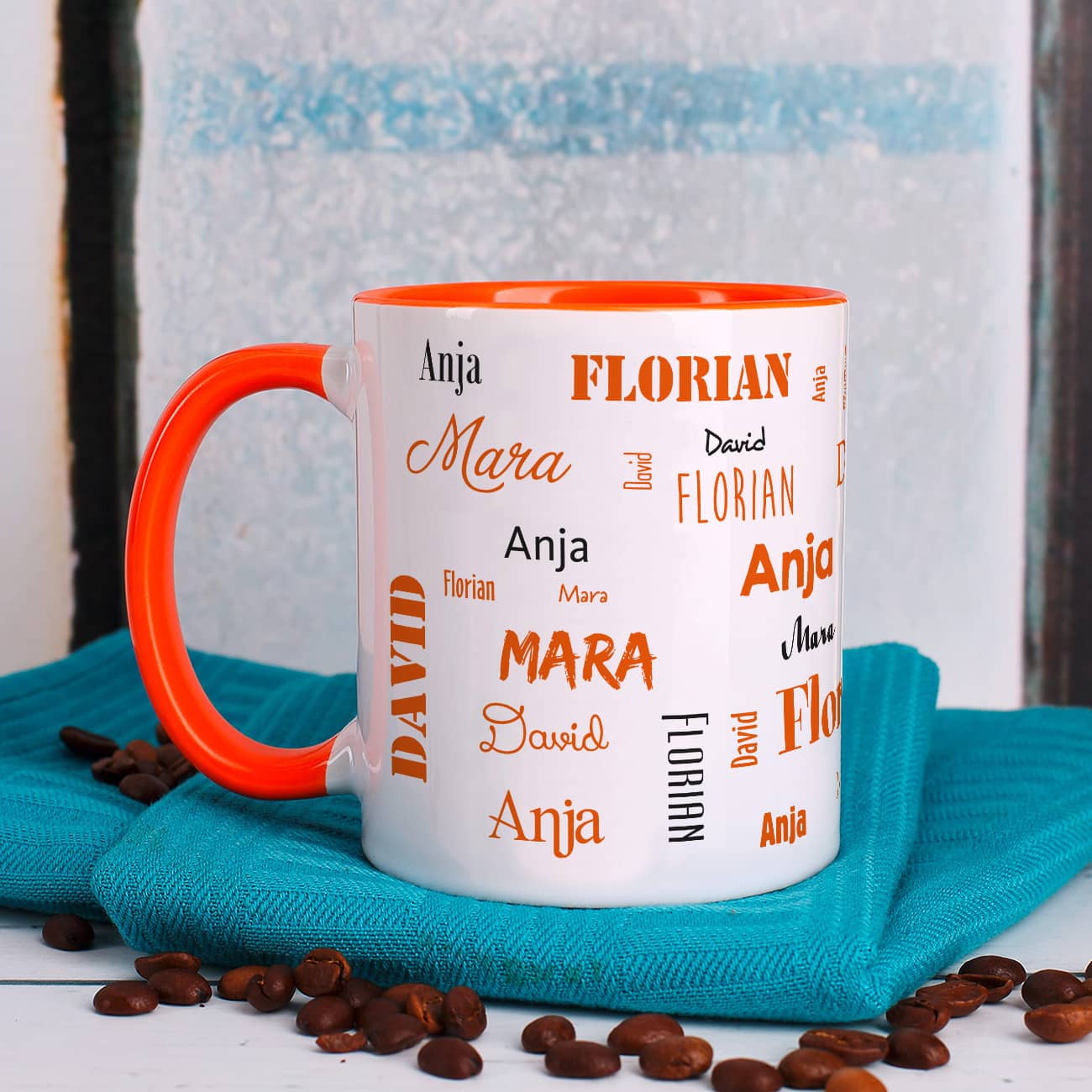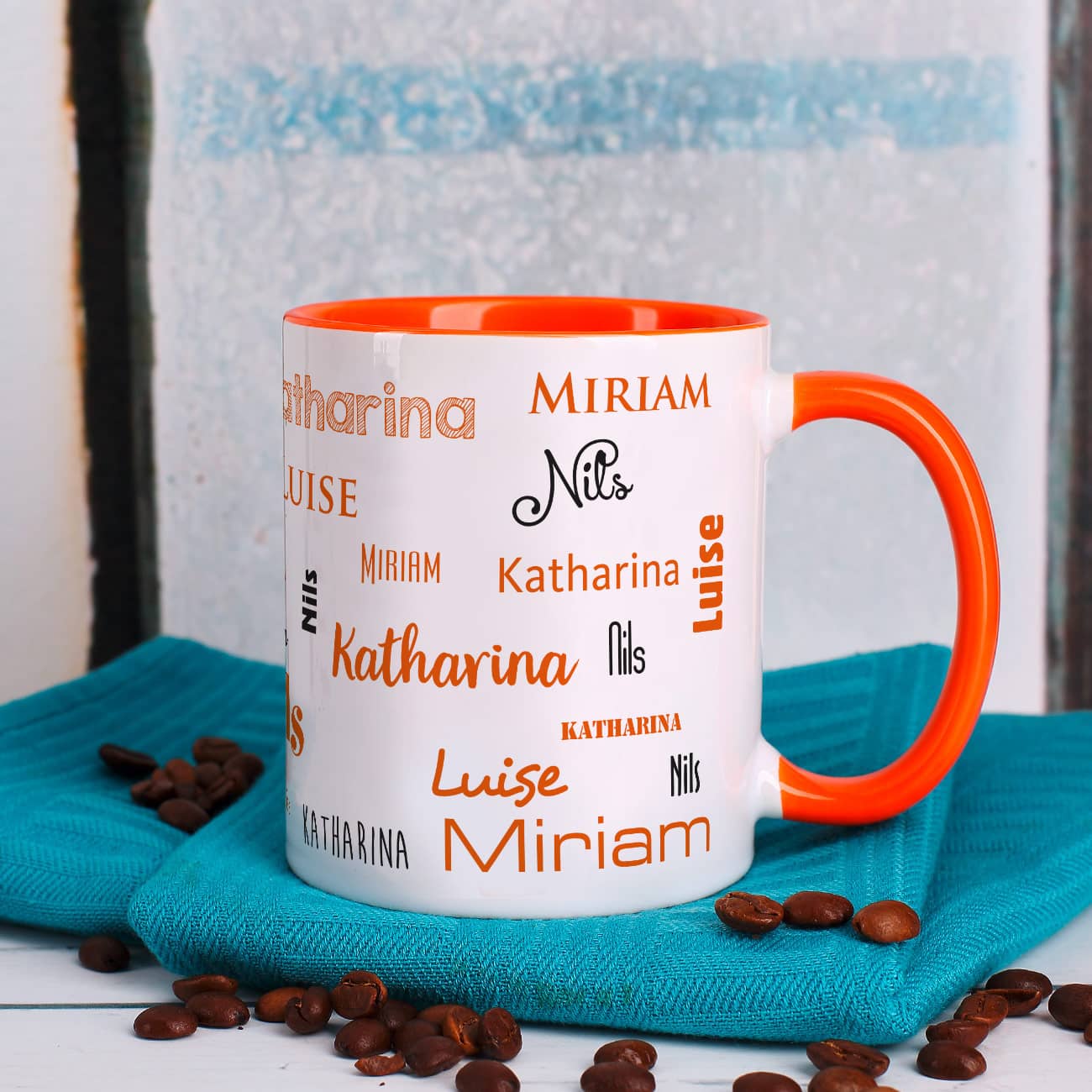 Vier Namen - Familientasse mit orangefarbenem Rand und Henkel
