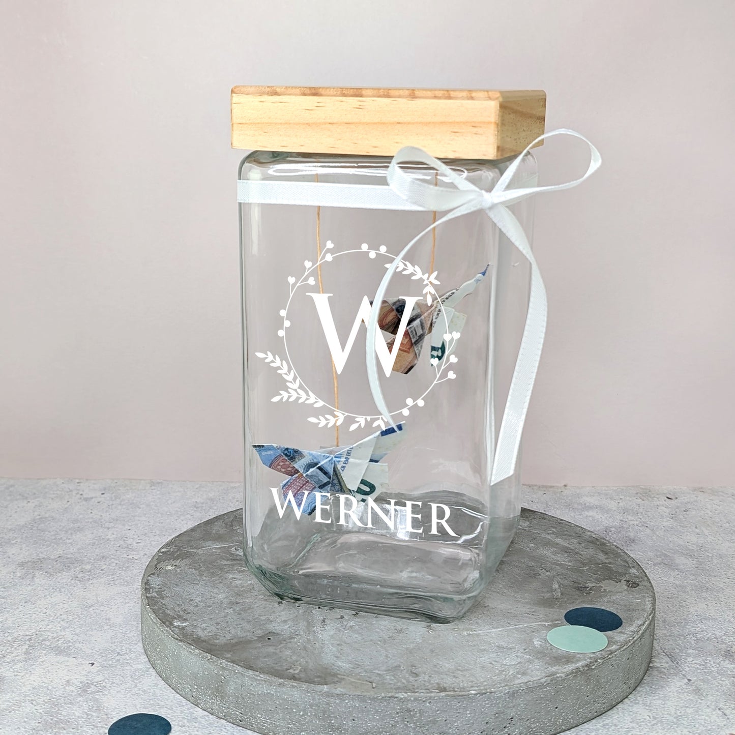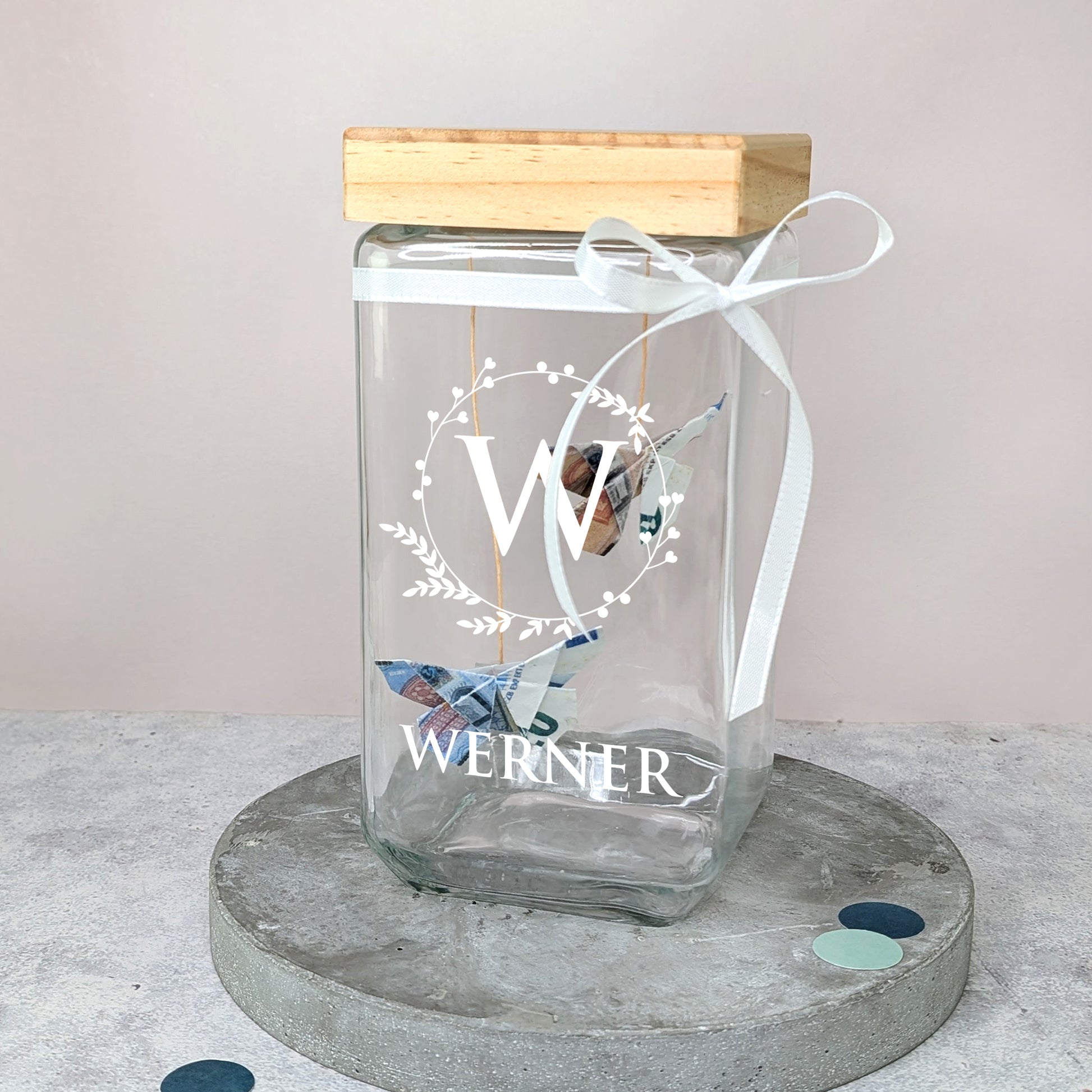- Glasbehälter mit personalisiertem Aufdruck (Initiale + Wunschtext)